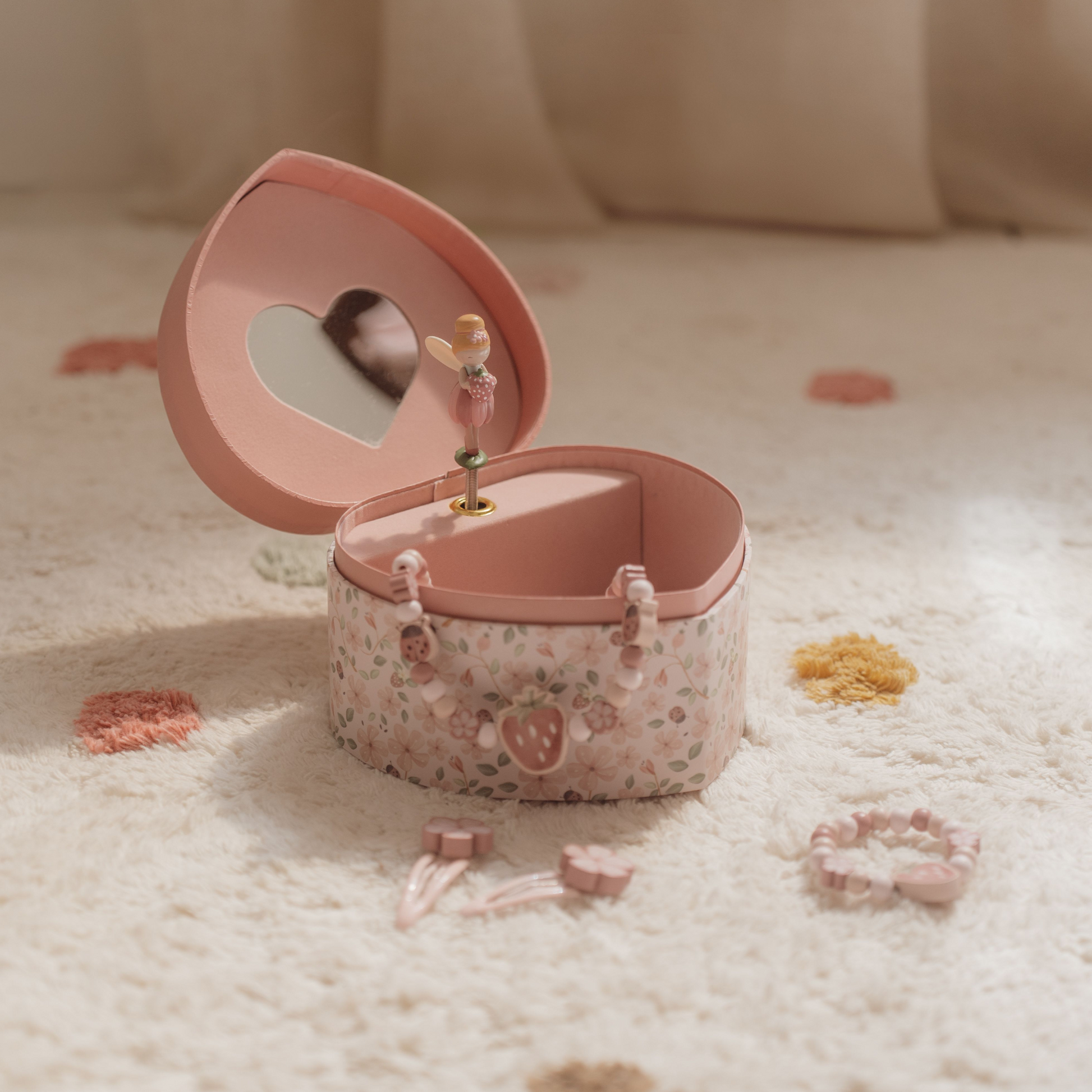 Dit kleurrijke doosje met het liefste feeetje en de mooiste bloemen erop biedt genoeg ruimte voor sieraden of andere waardevolle spulletjes. Als je het opwindt, speelt er muziek als het doosje wordt geopend en begint er een klein feeetje te dansen voor de spiegel. Dit is het perfecte cadeau dat je kleintje een leven lang zal koesteren!