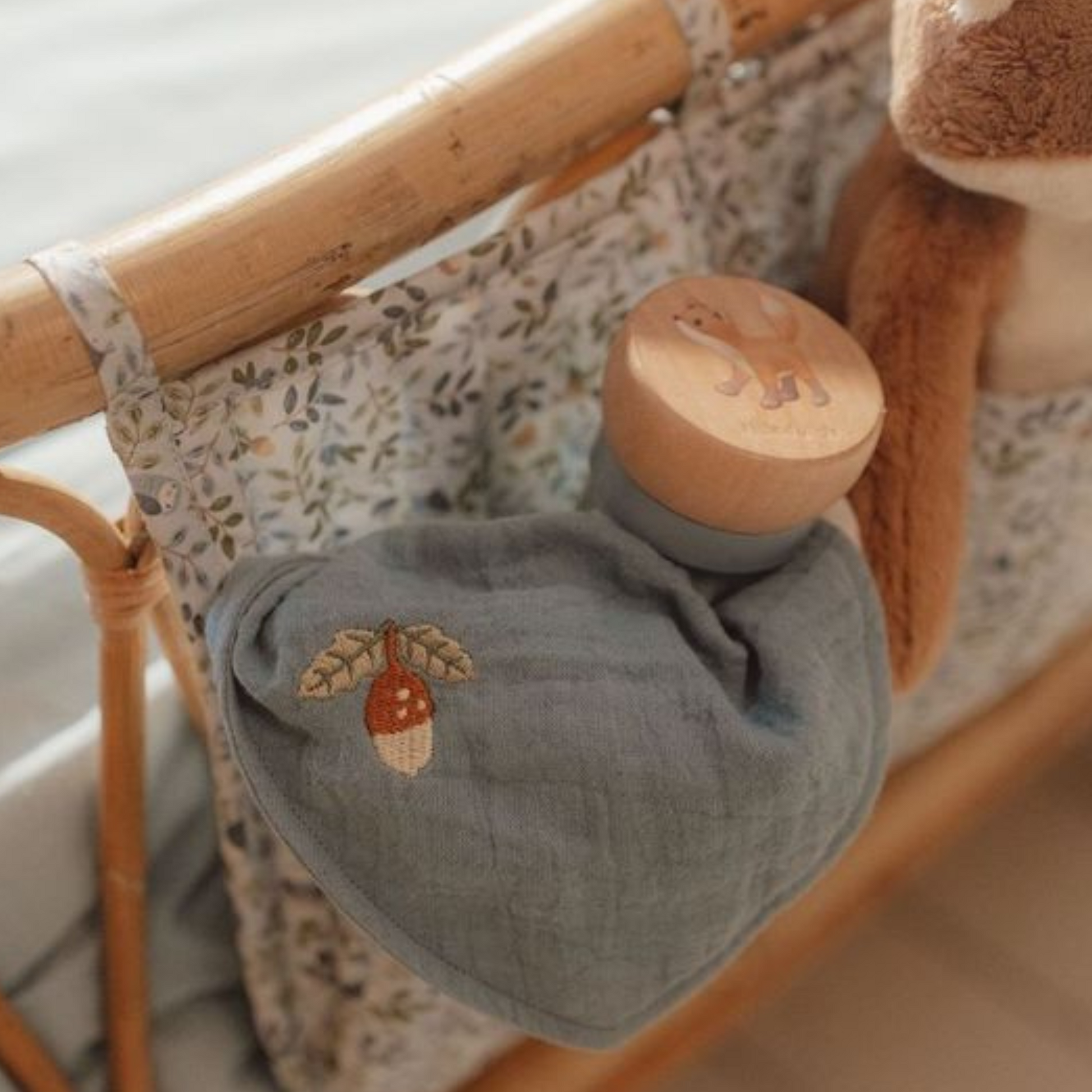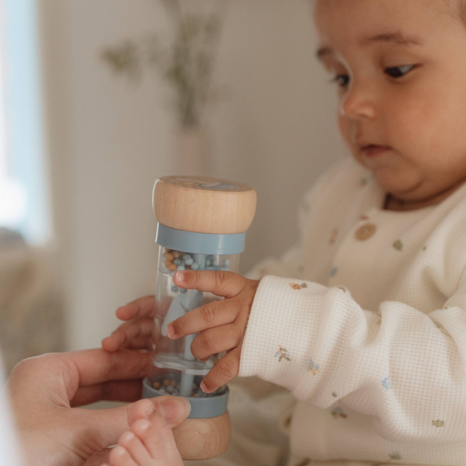Draai de regenrammelaar om en luister naar de rustgevende druppelgeluidjes van de balletjes die van de ene naar de andere kant van de regenmaker bewegen. Het stimuleert de zintuiglijke ontwikkeling en het muzikale talent van je baby. De balletjes, vallen door kleine openingen in de buis en laten de propeller draaien, wat resulteert in een aangenaam geluid. De regenrammelaar is ontworpen voor kleine handjes en ligt lekker in de hand. De houten boven- en onderkant zijn versierd met een illustratie van een klein vosje en een paar paddenstoelen en uit de Forest Friends -collectie.
