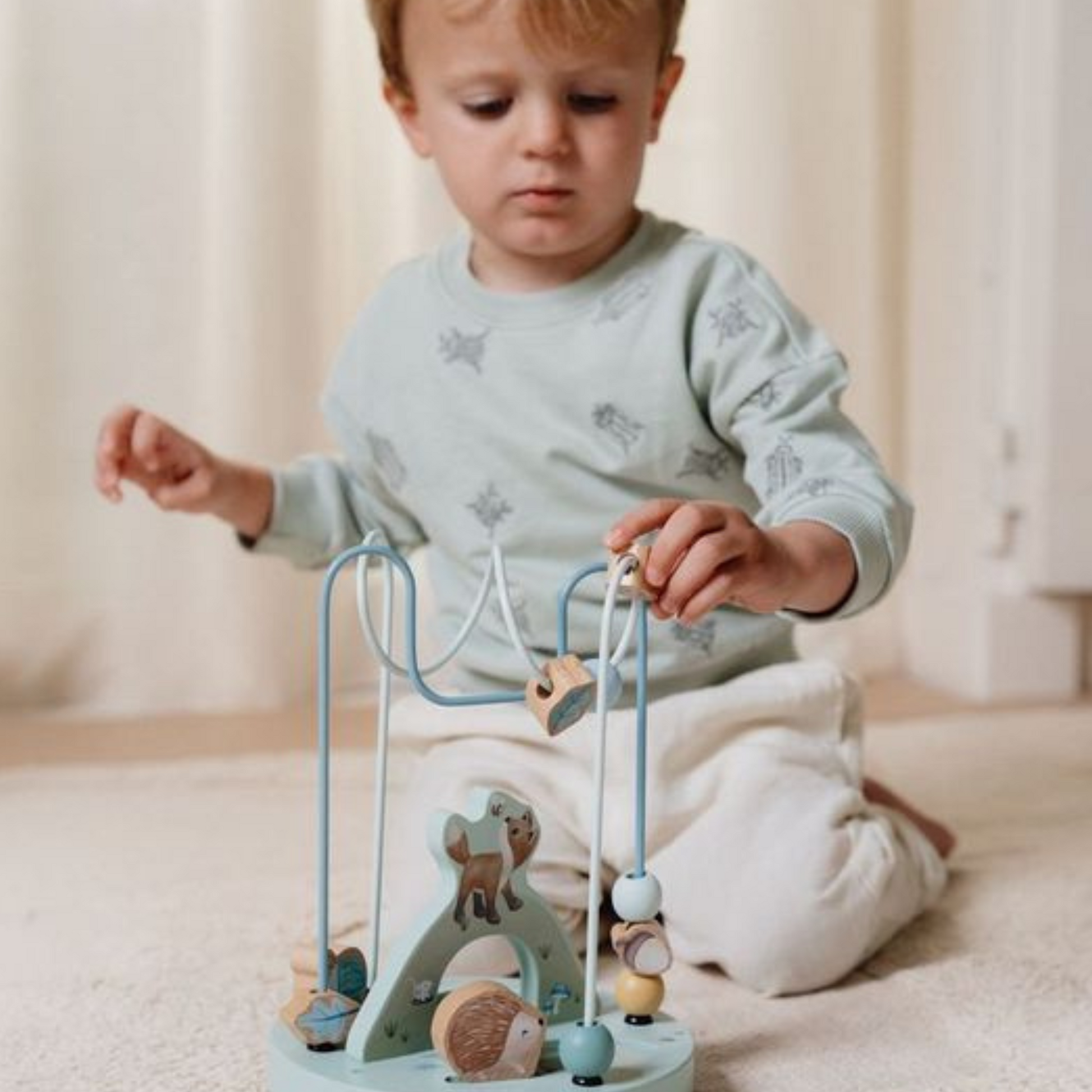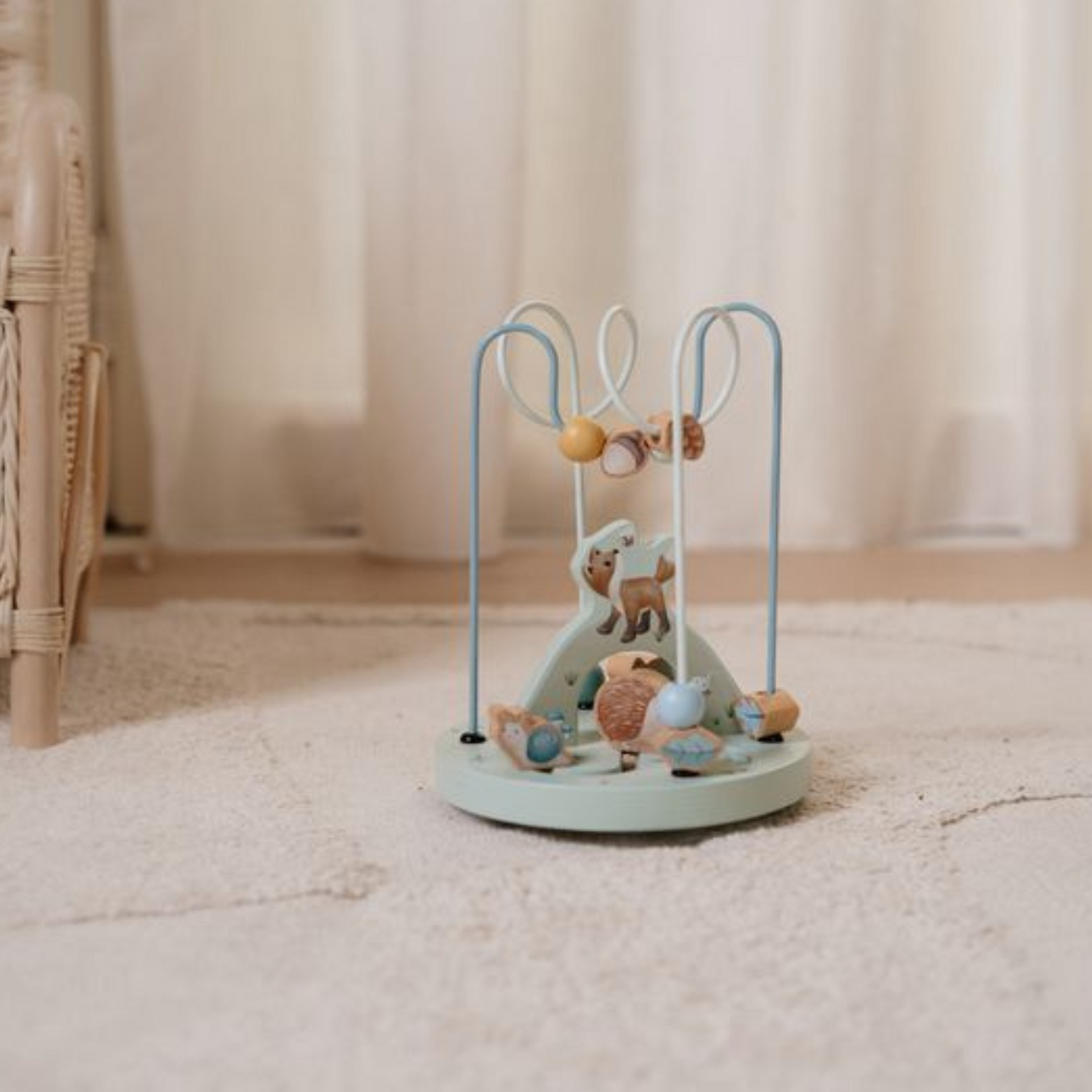 Onderweg ontmoet je de vriendelijke vos, de egel, het kevertje en de kleine slak, die leven en spelen in het bos. Schuif ze heen en weer om de smakelijke eikels, weelderige bladeren en dennenappels te ontdekken die verscholen liggen tussen de wortels van de bomen. Gebruik je verbeelding en laat het avontuur beginnen! Deze houten activiteitenspiraal biedt een leerzame en betoverende ervaring voor je kindje.