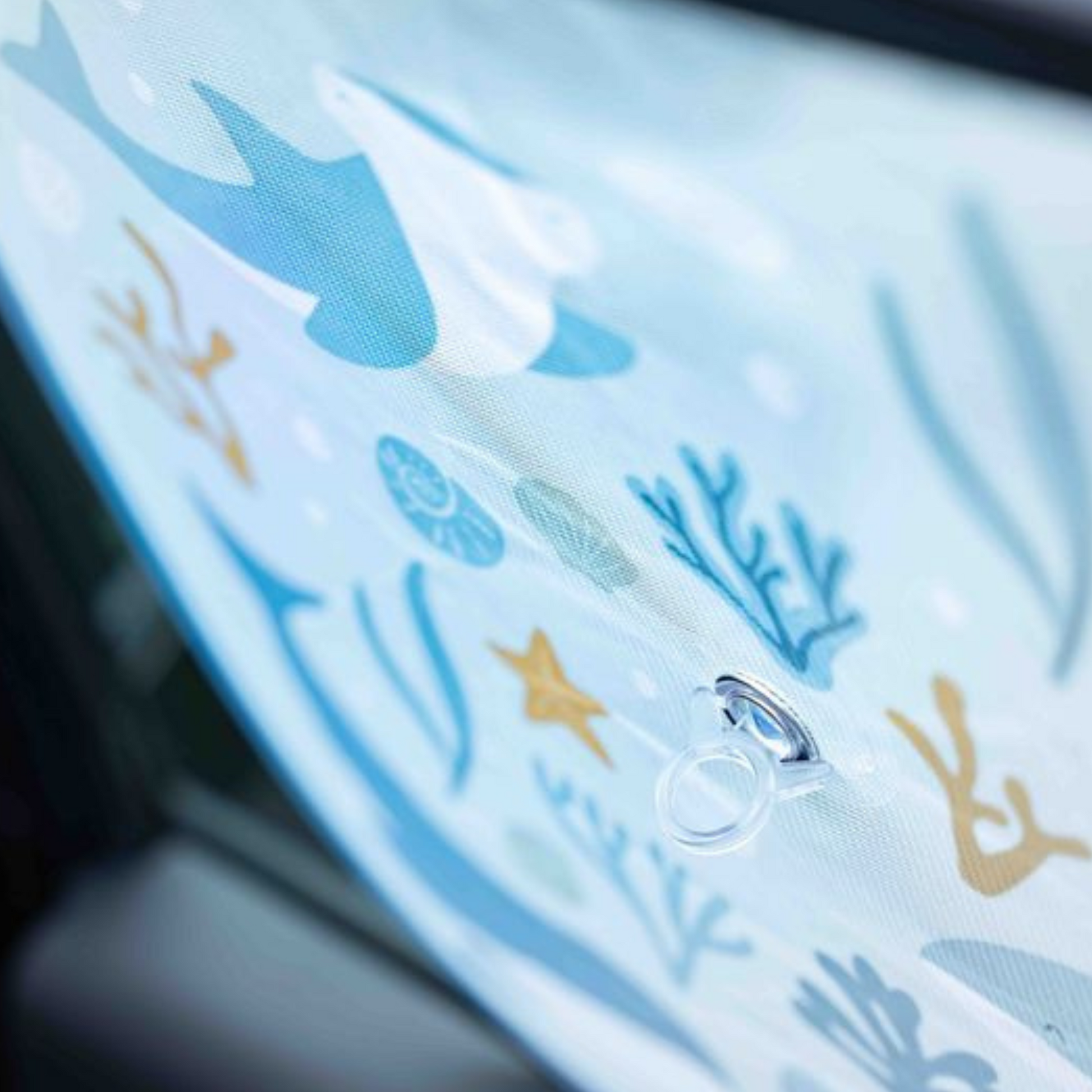 Houd je kindje comfortabel en veilig tijdens een ritje in de auto met deze twee leuke zonneschermen. Ze beschermen je kindje tegen zonlicht en UV-straling en houden een deel van de warmte buiten. Met de zuignappen bevestig je de zonneschermen gemakkelijk aan de zijruiten en blijft het koel achterin. Het Ocean Dreams Blue-ontwerp vrolijkt de auto in stijl op. Eén zonnescherm is ongeveer 45x37 cm en past op de meeste autoruiten.