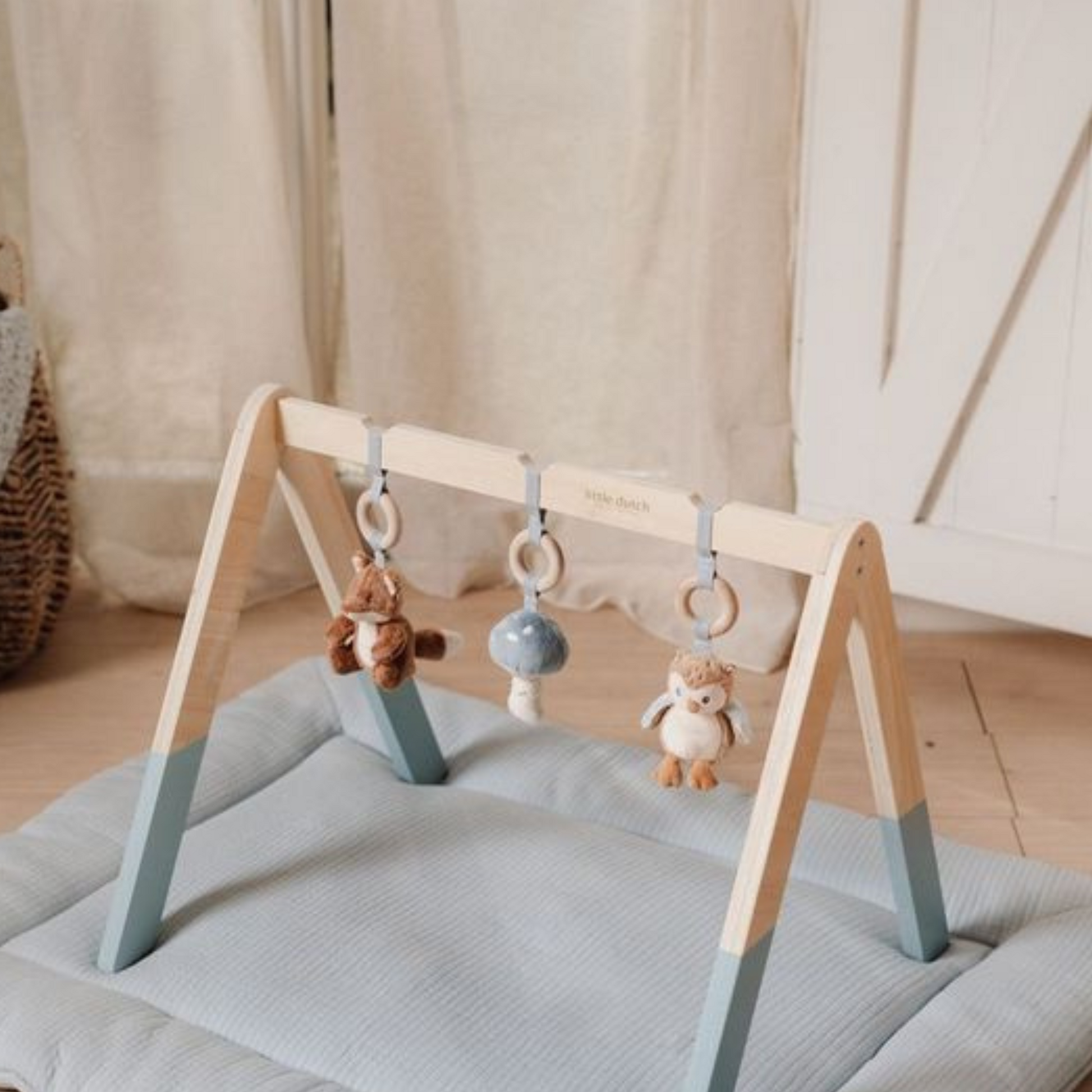 Nieuwsgierige baby's vermaken zich kostelijk met deze houten babygym. Er zijn drie verschillende activiteitenspeeltjes die voor het vermaak zorgen: een lief vosje, de wijze uil en een paddenstoel. De babygym ontwikkelt de hand-oogcoördinatie, verbetert de motoriek en stimuleert de zintuigen elke keer dat je kleintje naar een van de speeltjes grijpt. WAARSCHUWING: Om te voorkomen dat het kind verstrikt raakt, en zich bezeert, verwijder dit speelgoed wanneer het kind op handen en voeten begint te kruipen. Te monteren door een volwassene.