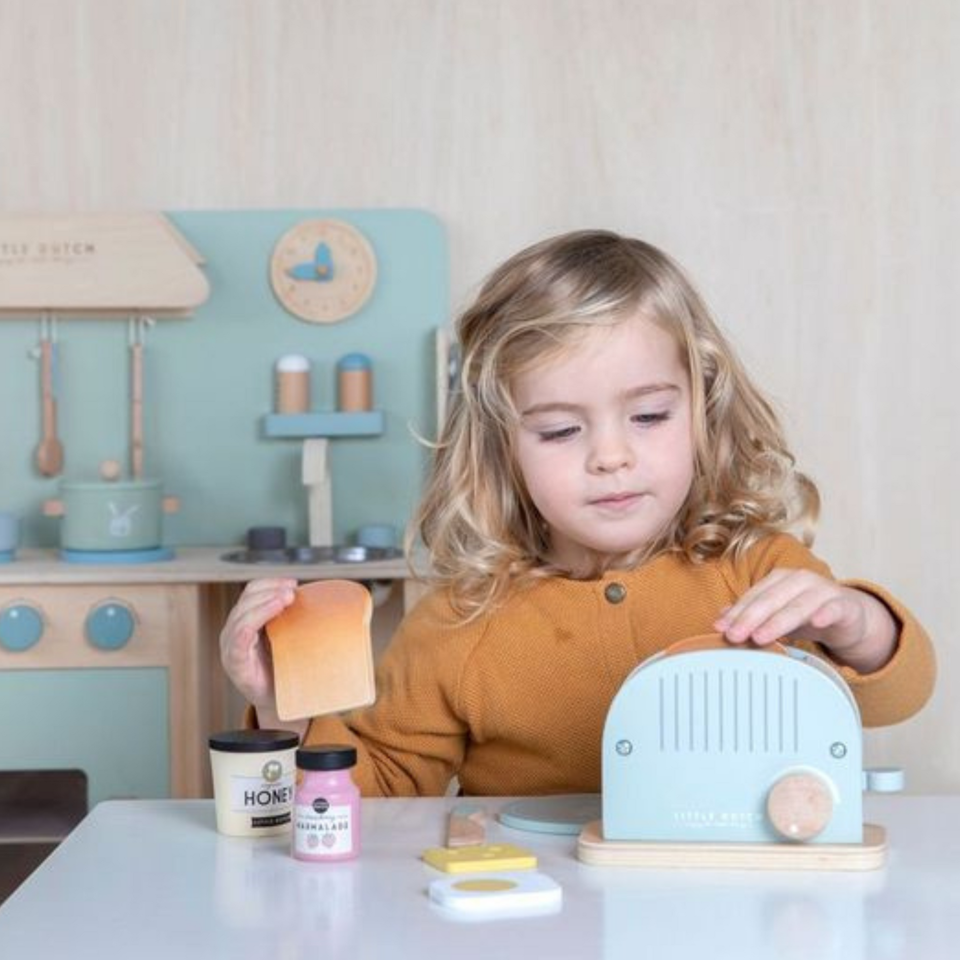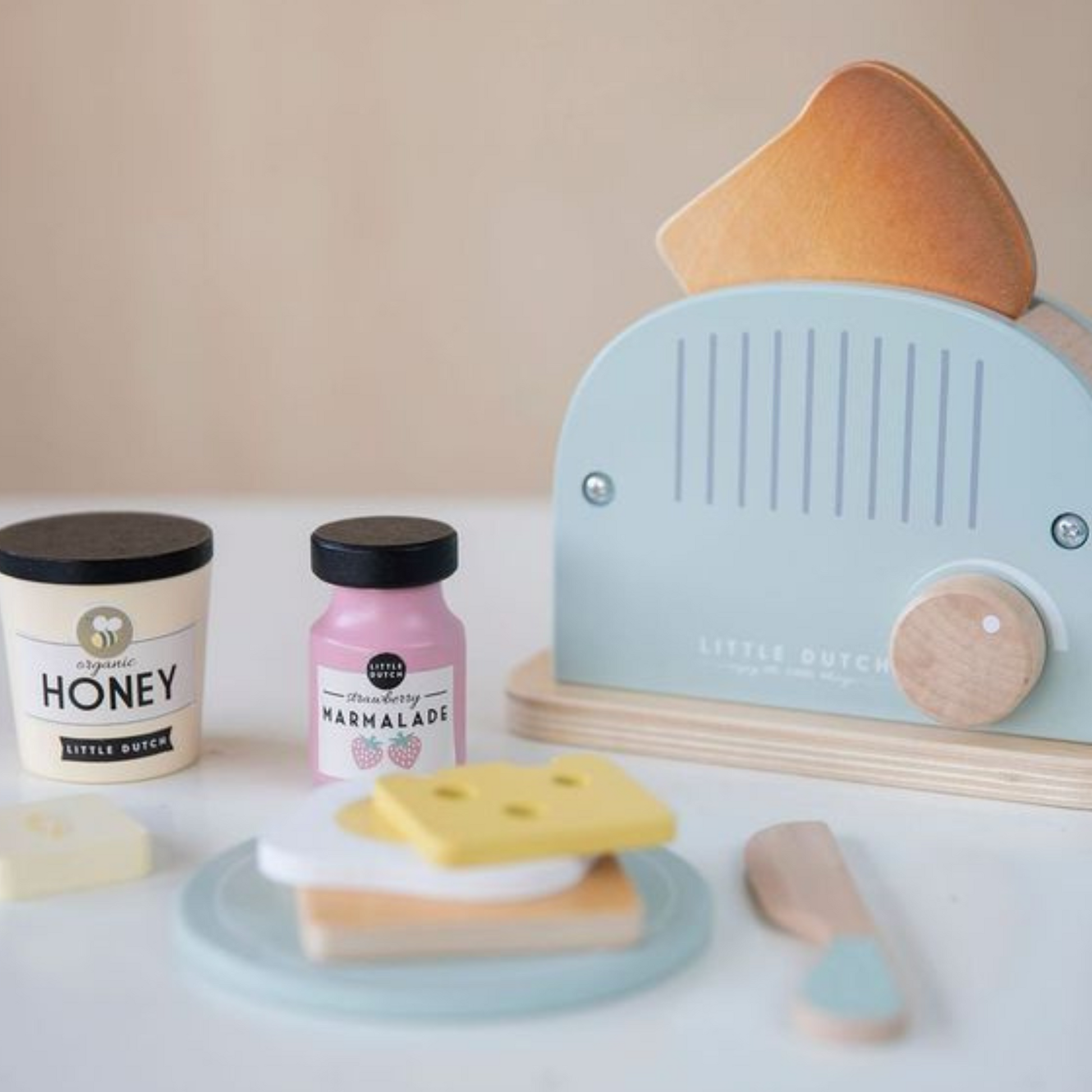 Doe de sneetjes brood in de broodrooster en duw de hendel naar beneden. Als de geroosterde boterhammen tevoorschijn komen, zijn ze klaar om te serveren. Voeg wat boter, kaas, marmelade of een gebakken ei toe om van het ontbijt een echt feestje te maken! In deze set vind je ook een houten bord en mesje. Kinderen vinden het heerlijk om de dagelijkse rituelen van hun ouders na te spelen, zoals het maken van het ontbijt. Deze broodrooster set stimuleert rollenspel en combineert mooi met het houten koffiezetapparaat.