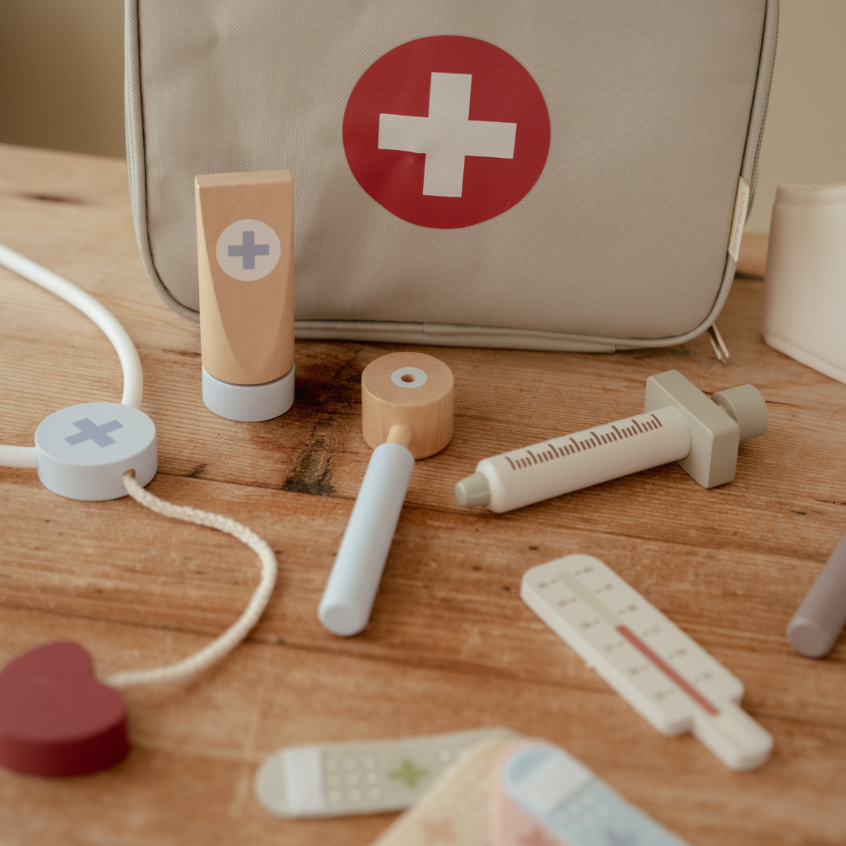 De Little Dutch Houten Doktersset is ideaal voor fantasierijk spel en een geweldig cadeau voor kleine dokters in de dop. Wie is de volgende patiënt?