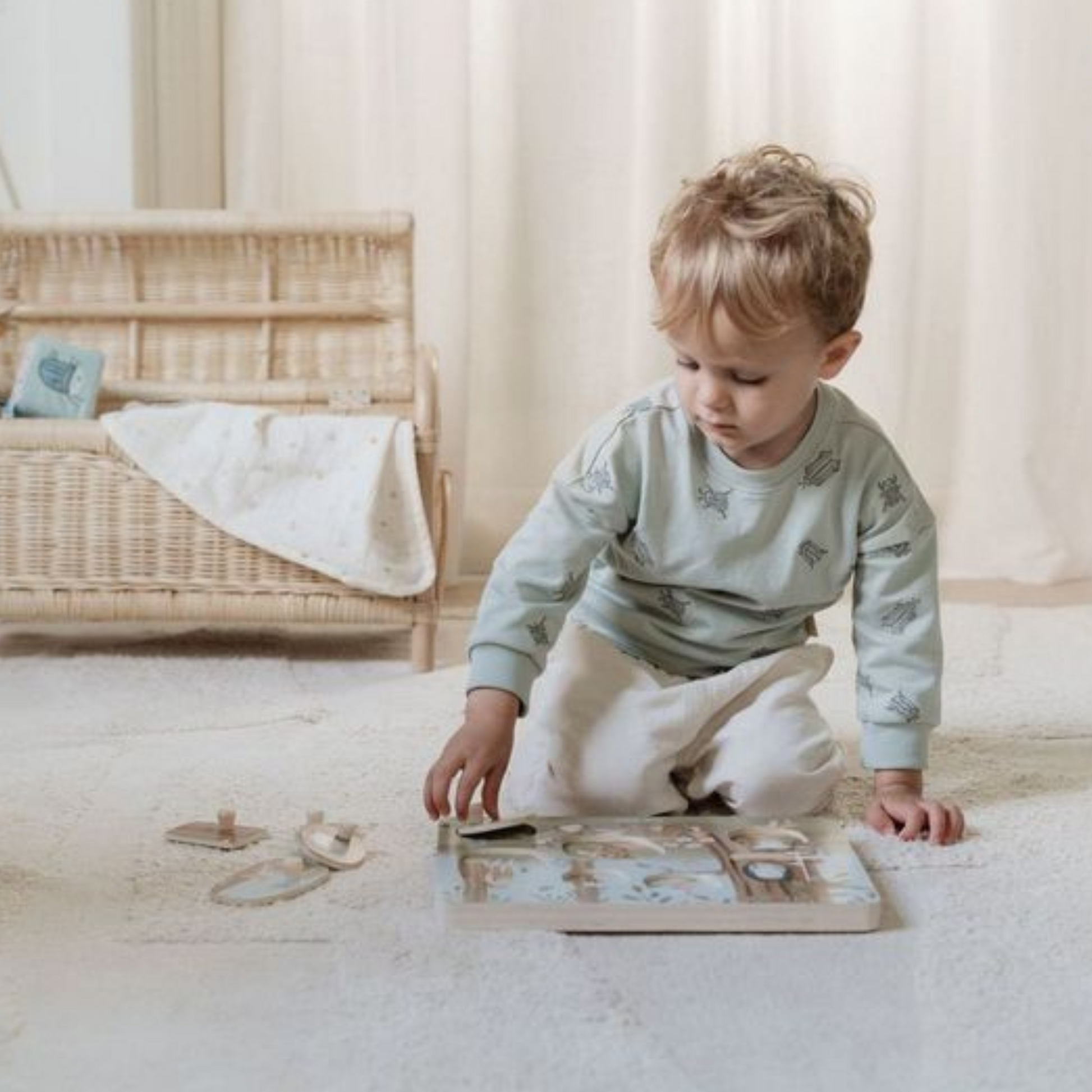 Herken de vormen en unieke geluiden met deze leuke geluidenpuzzel. Als je een stukje optilt hoor je een bijpassend geluidje. Deze puzzel met 7 stukjes van dieren, blaadjes en paddenstoelen, bevordert de oog- hand coördinatie en stimuleert de woordenschat van je kindje. De sensoren reageren wanneer een puzzelstukje wordt teruggeplaatst. Puzzel bevat door licht geactiveerde sensoren - gebruik bij fel licht voor de beste resultaten. Zorg ervoor dat de schakelaar op AAN staat om de geluidsfunctie in te schakelen. Sensoren kunnen per ongeluk worden geactiveerd door direct zonlicht, dus schakel ze altijd uit als er niet mee wordt gespeeld. (Batterijen (2 x AAA) niet inbegrepen.)