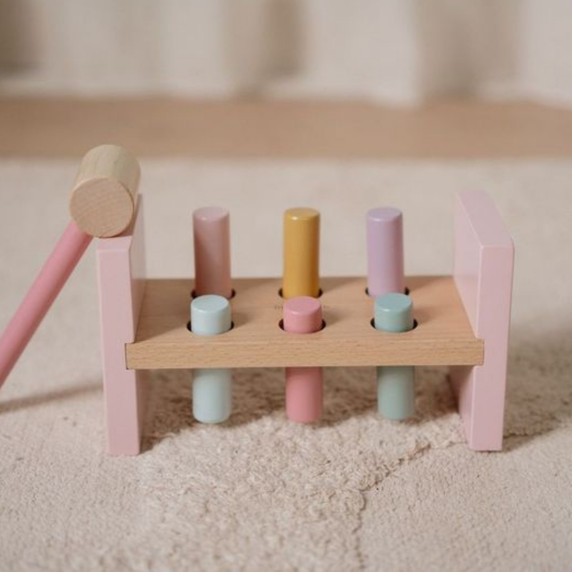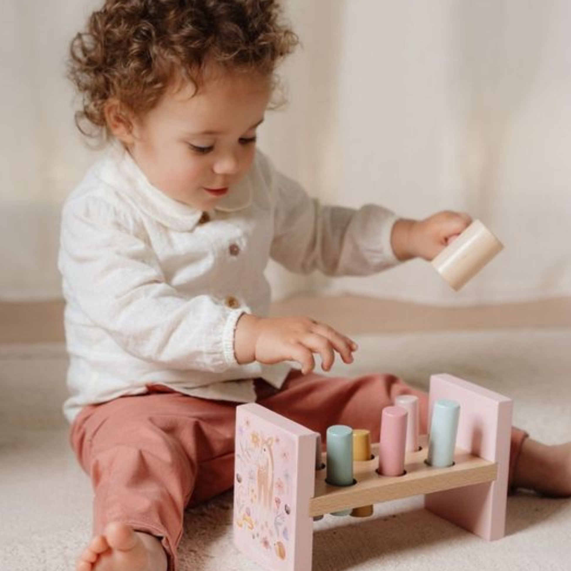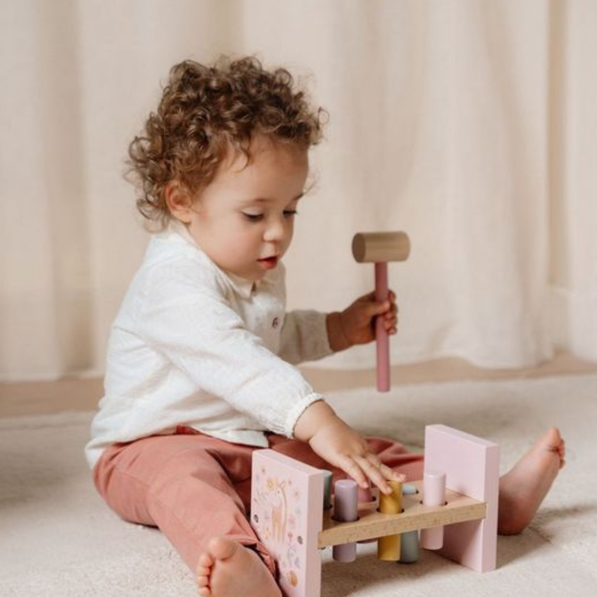 Gebruik de hamer om de 6 gekleurde staafjes in het houten hamerbankje te timmeren en verken de magie van Fairy Garden. Zijn alle staafjes naar beneden getimmerd? Draai het bankje om en begin op nieuw! Dit is een goede oefening voor de motoriek dat je kindje wel even zoet houdt.