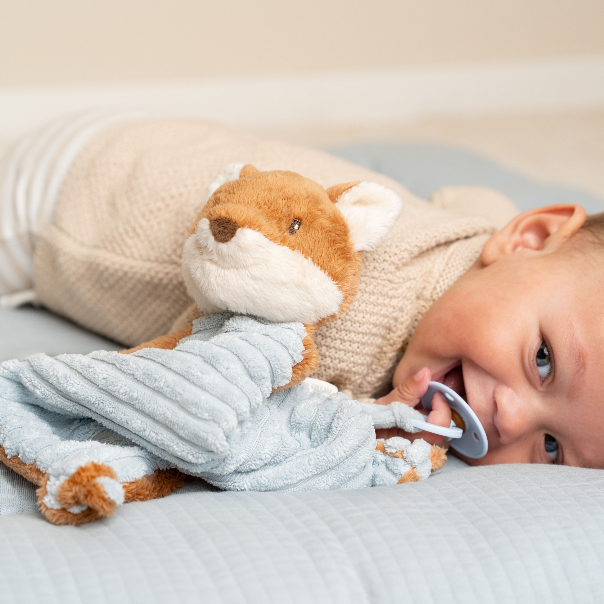 Dit knuffelvriendje staat klaar om lekker te knuffelen en je te troosten, waar en wanneer je maar wilt. De vriendelijke vos zal je geruststellen met zijn magische zachtheid en geeft je een warme omhelzing wanneer je een vriendje nodig hebt. Het lichaam van de vos is een heerlijke zachte doek met speelse labels, een Forest Friends borduursel en twee knopen die kleine handjes makkelijk vast kunnen pakken. Met de handige lus kun je er eenvoudig een speentje aan vast te maken, zodat het altijd binnen handbereik is.