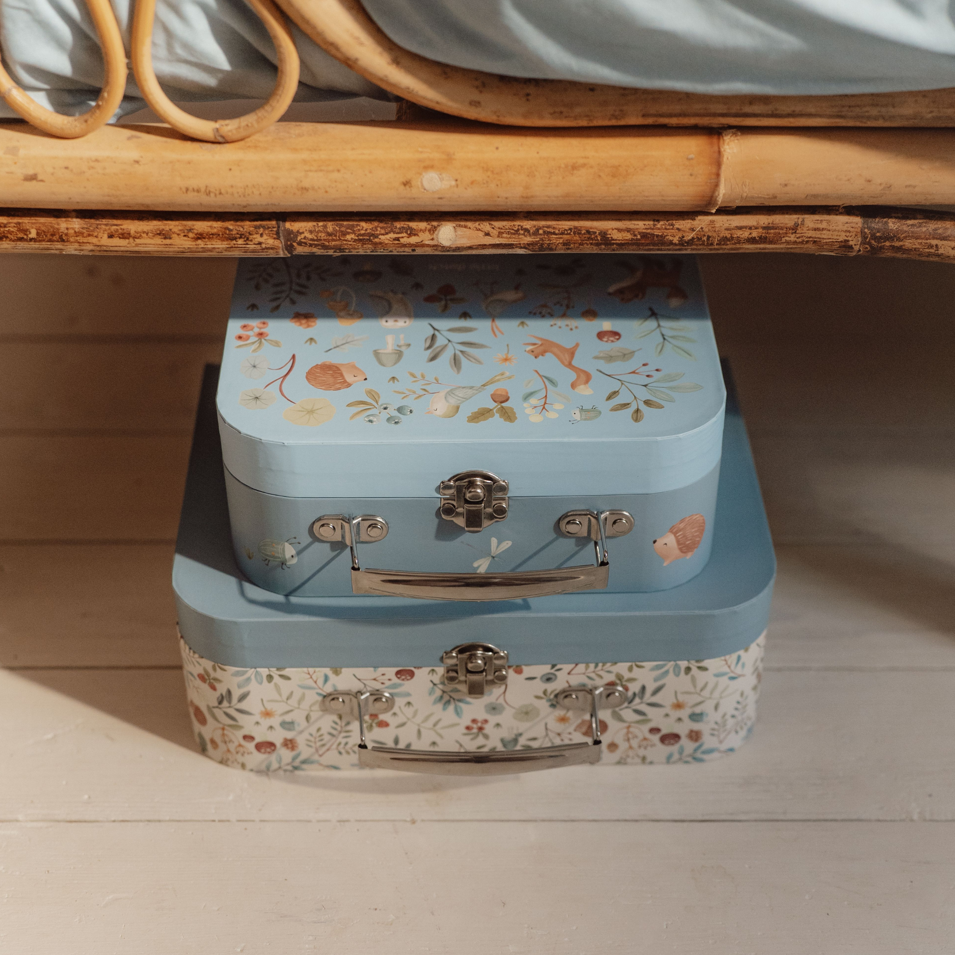 De set bestaat uit twee speelkoffers in het Forest Friends-thema, met schattige illustraties van een vos. De binnenkant is bedrukt met een mooie print. Beide koffers hebben een klassieke metalen greep en slotje, perfect voor kleine ontdekkingsreizigers.