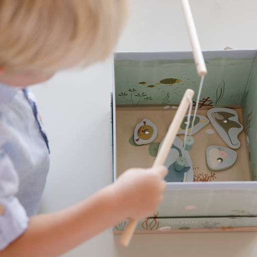 Pas wel op dat je niet de oude schoen aan jouw hengel krijgt! Dit klassieke hengelspel stimuleert de fijne motoriek en de concentratie van kinderen. Bovendien kan het spelniveau aangepast worden aan de leeftijd van de spelers, zodat zowel jonge als oudere kinderen er veel plezier aan beleven. De onderwaterdieren zijn van hout gemaakt en het aquarium is van karton.