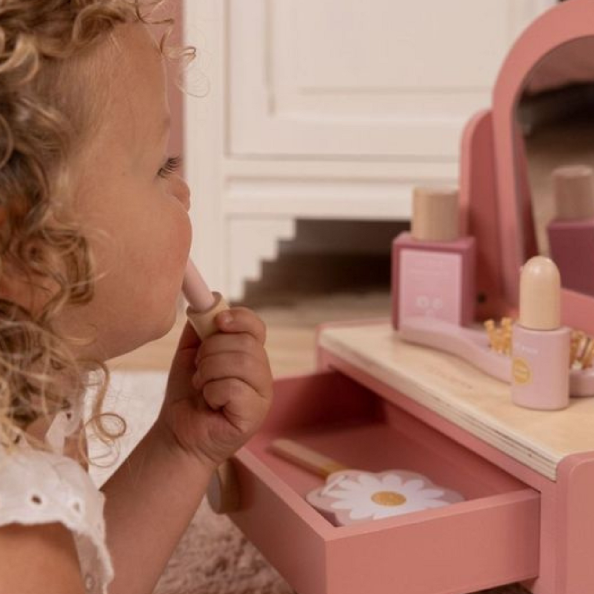 Deze roze houten kaptafel voor kinderen stimuleert fantasierijk spel en zorgt voor eindeloos veel speelplezier. De kaptafel beschikt over een draaiende spiegel en 6 houten schoonheidsproducten, zoals een haarborstel, lippenstift, parfum, oogschaduw, nagelvijl en nagellak. De kaptafel heeft ook een opberglade om haarbanden, elastiekjes en speldjes (niet inbegrepen) in te bewaren. Geschikt vanaf 3 jaar.