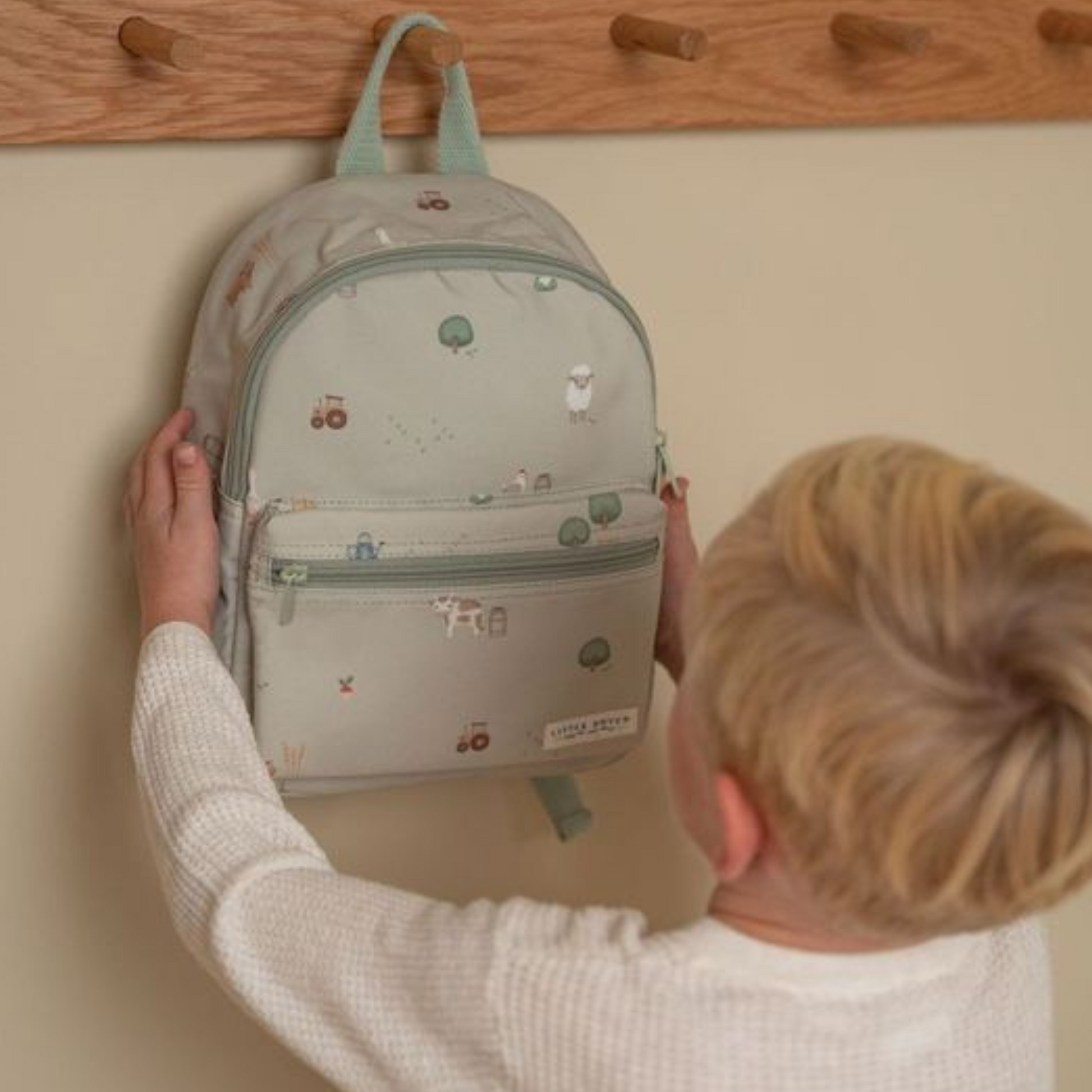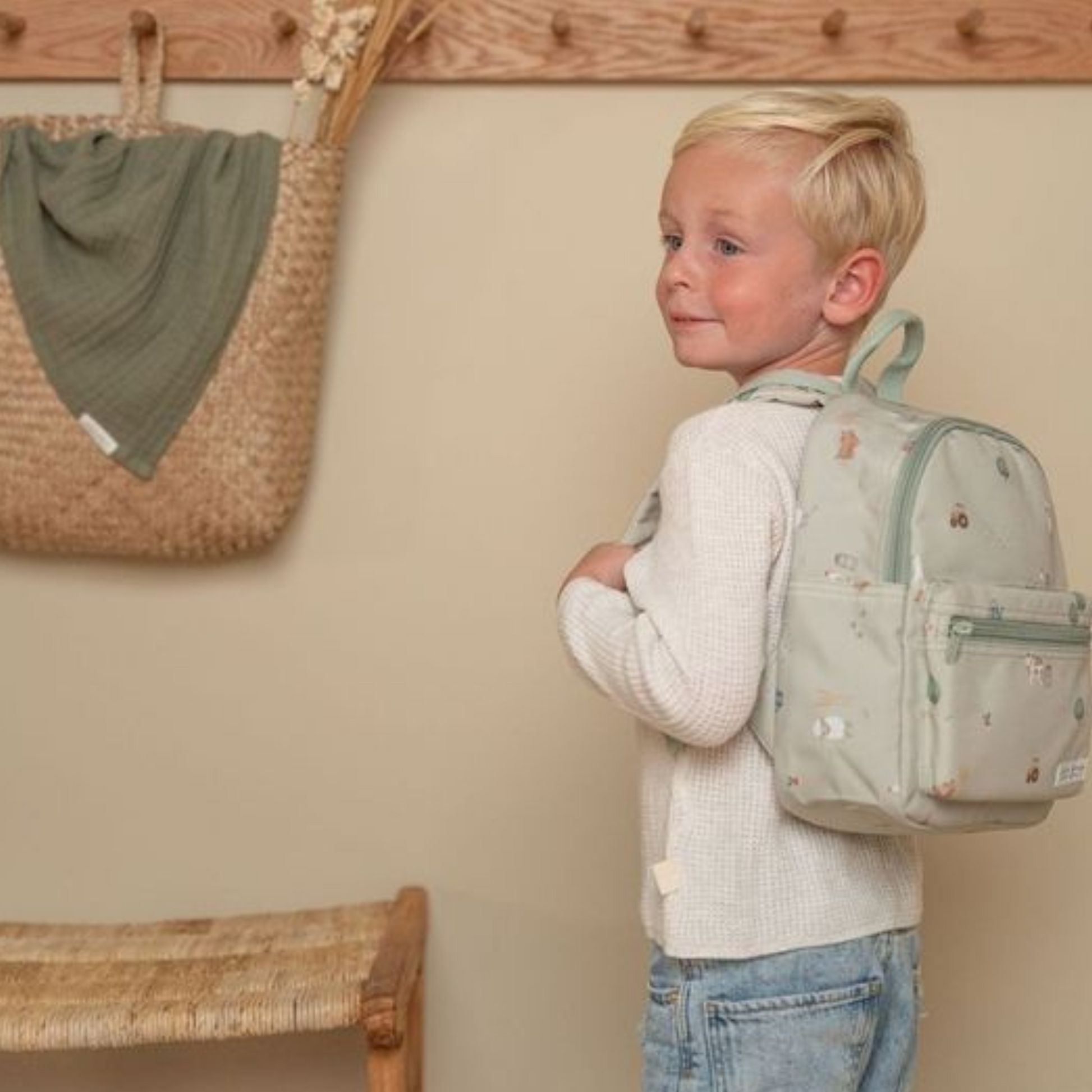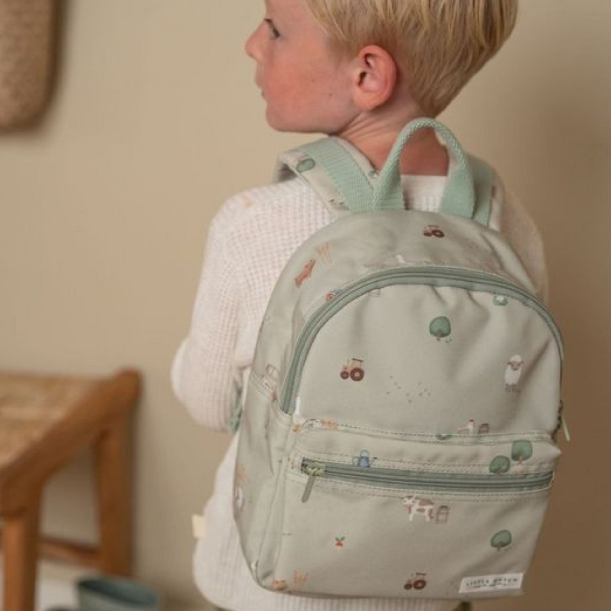 Het rugtasje is gemaakt van tien gerecyclede petflessen. De schouderbanden van de tas zijn verstelbaar en kunnen worden ondersteund door de borstband vast te maken. In de tas zitten twee elastische banden om drinkbekers rechtop te houden zodat deze niet gaan lekken. In het voorvak kunnen koekjes, maar ook de mooiste kleine schatten bewaard worden. In de tas zit een label waarop je de naam en het adres van je kindje kunt noteren