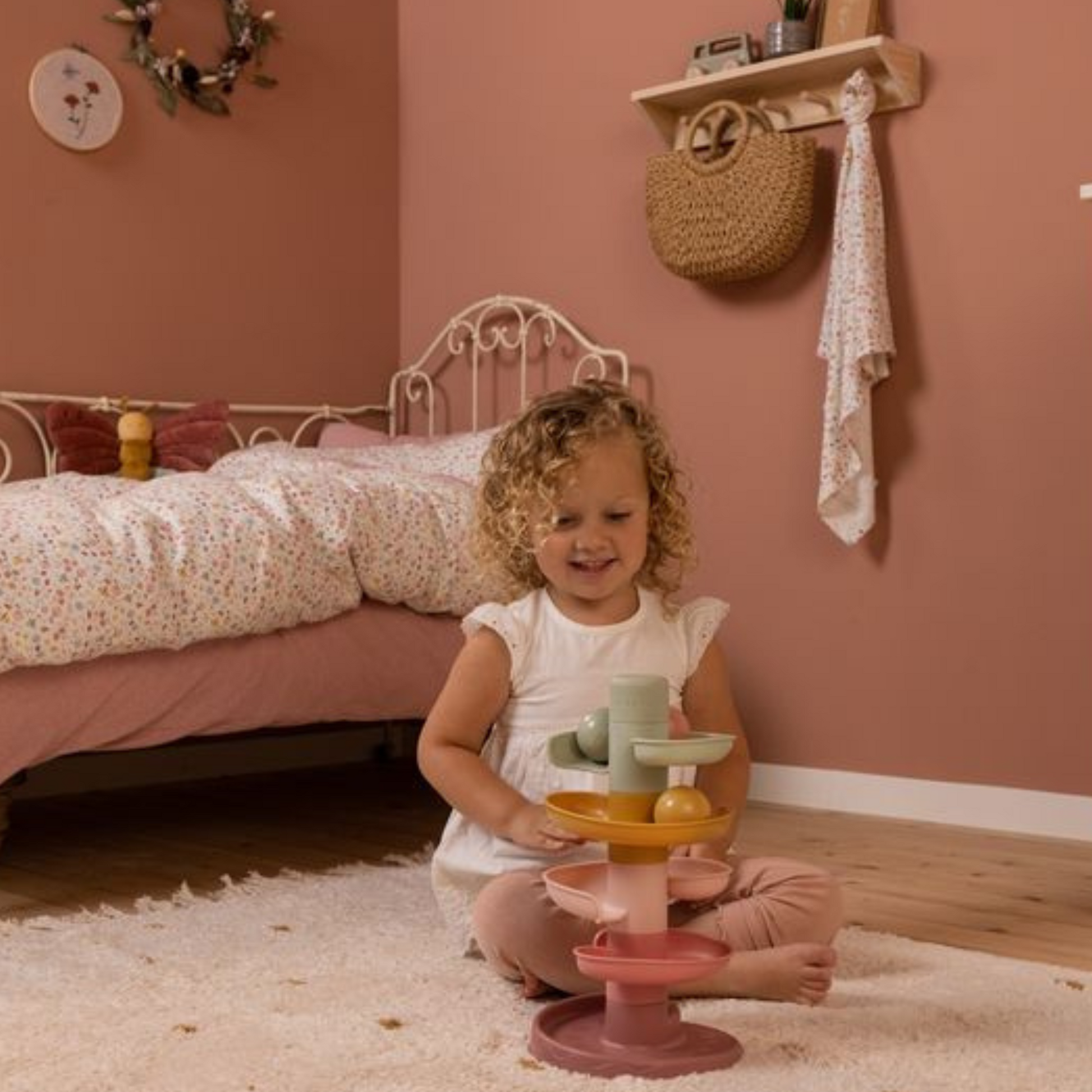 De spiraaltoren van Little Dutch zorgt voor eindeloos veel speelplezier. Deze kleurrijke set bestaat uit 5 subtiel gekleurde delen die jouw kleintje gemakkelijk op elkaar stapelt. Laat de ballen een voor een op de bovenste laag vallen en kijk hoe ze achter elkaar naar beneden rollen en slingeren. De spiraaltoren draagt bij aan de ontwikkeling van de hand-oog coördinatie en leert kleintjes over oorzaak en gevolg, waarmee het zowel leuk als leerzaam spelen is. Bij de spiraaltoren zitten standaard 3 lichte en gemakkelijk vast te pakken ballen in verschillende kleuren die bij beweging een geluidje maken. Dit speelgoed is uitgevoerd in de kenmerkende Little Dutch kleuren oudroze, roze, lichtroze, groen en okergeel. De afmeting is: 18 x 18 x 30 cm. Wordt geleverd in full-colour doos. Geschikt voor kinderen vanaf 10 maanden.