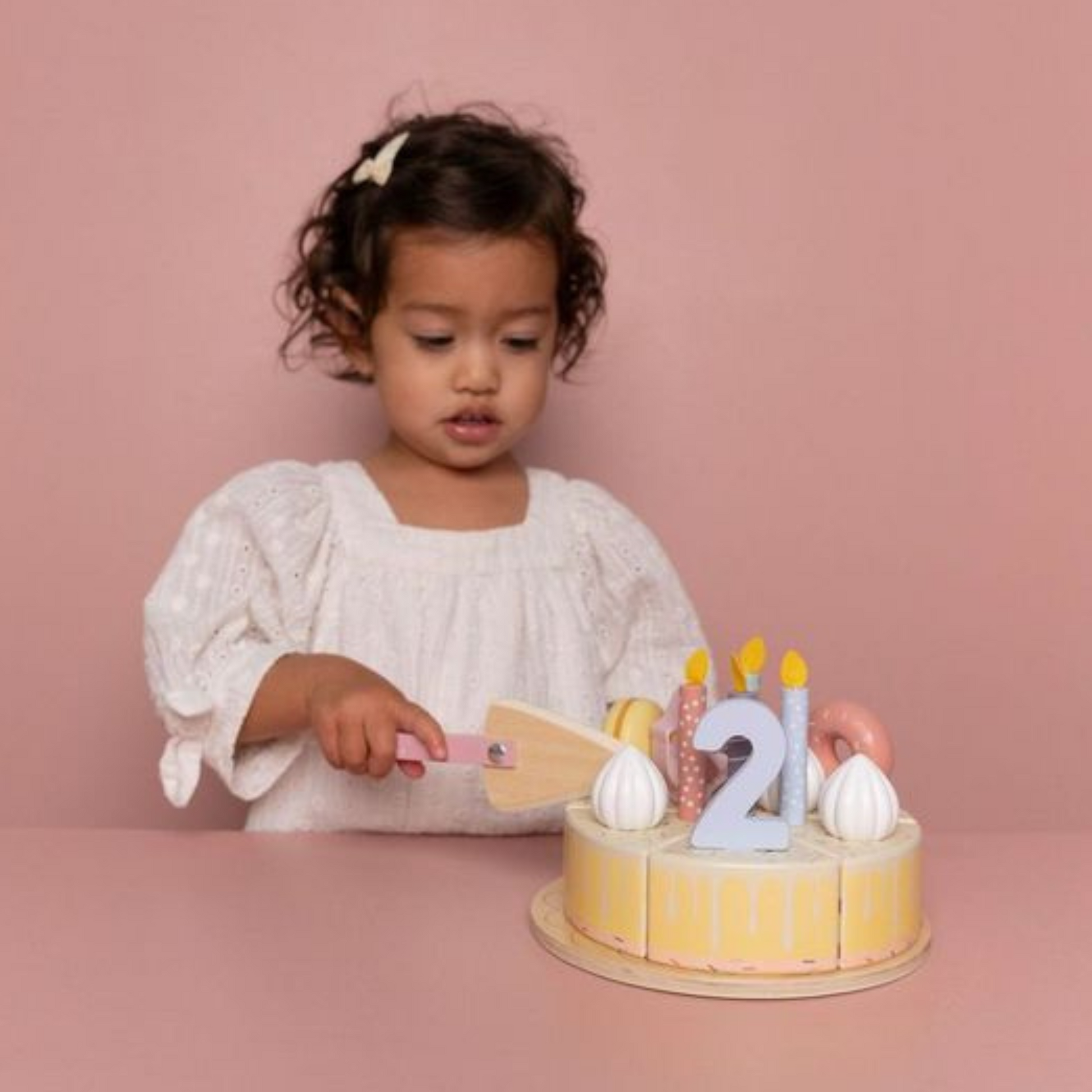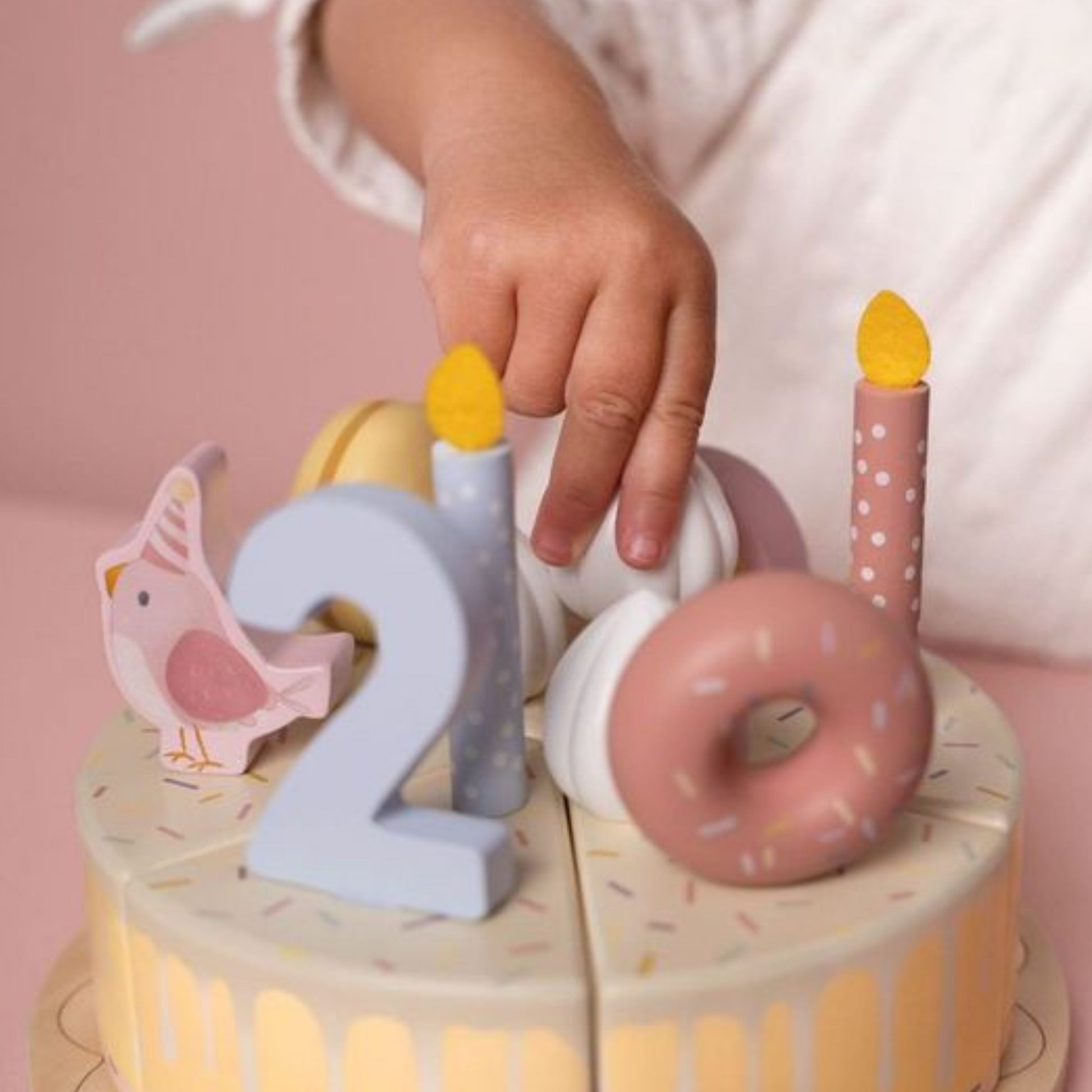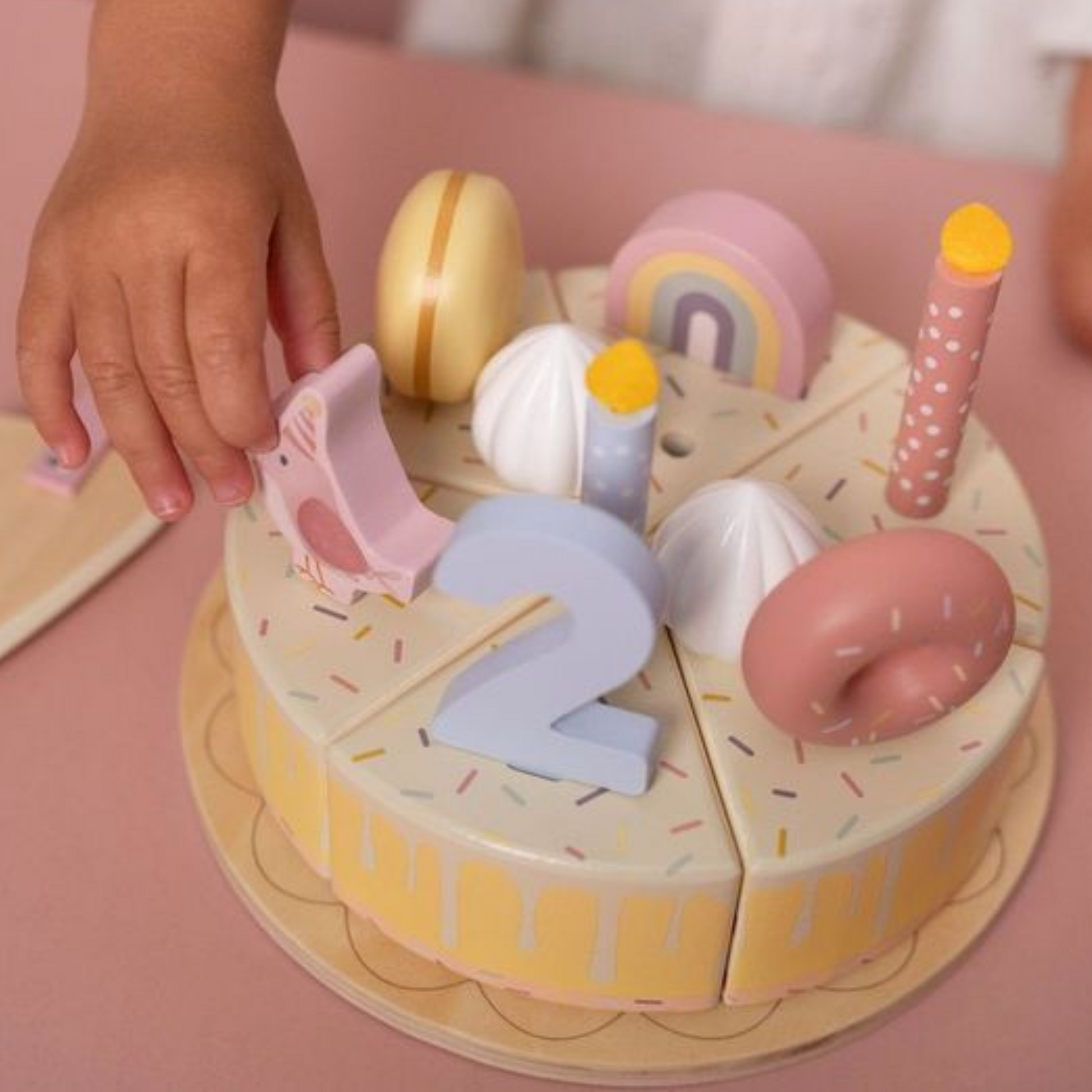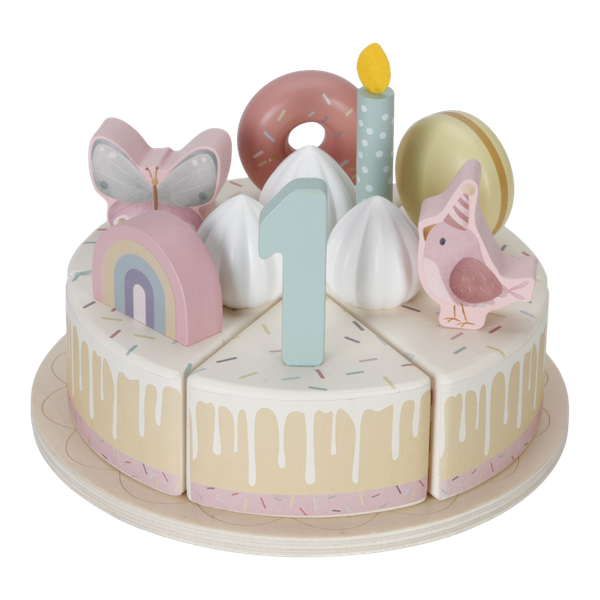 Haal de slingers maar tevoorschijn, want met onze taart is iedere dag een feestje! Versier je taart met een macaron, donut, regenboog, diertjes en slagroom en trakteer alle gasten op een stukje. Veel plezier op het feest. De set bestaat uit zes stukjes taart op een plateau, een taartschep, donut, macaron, vogeltje, vlinder, regenboog, kaarsjes, slagroomtoefjes en cijfertoppers (1-5).