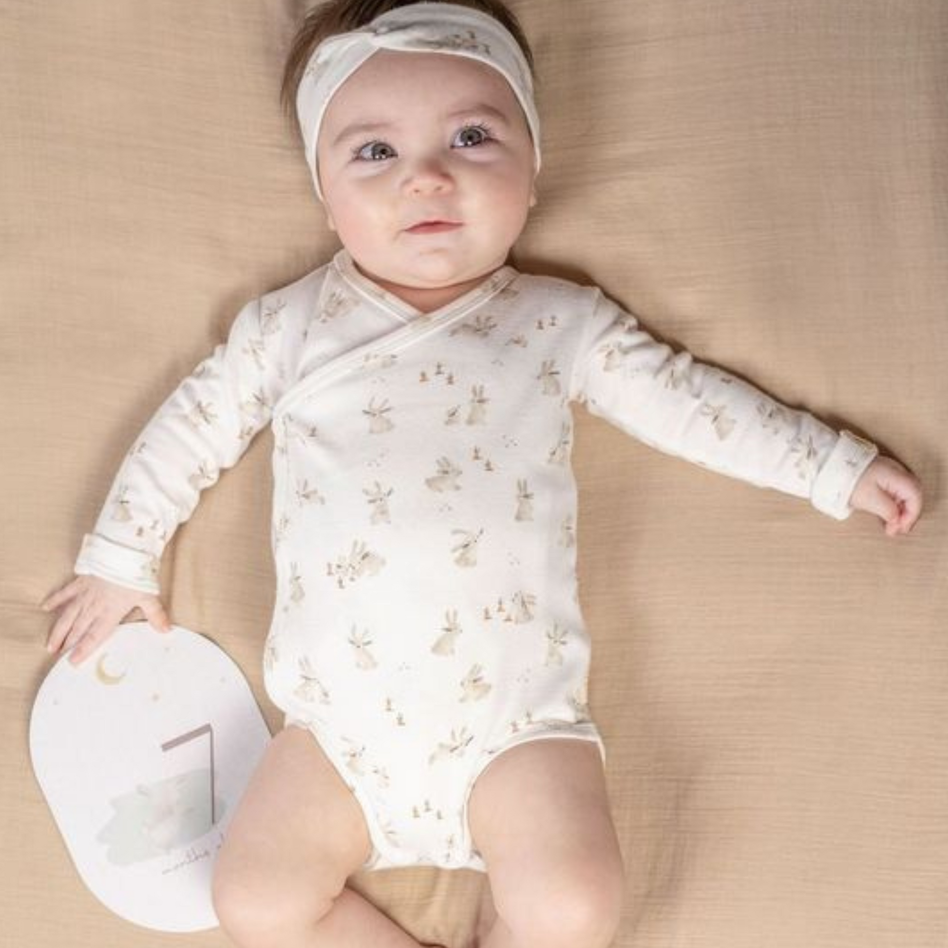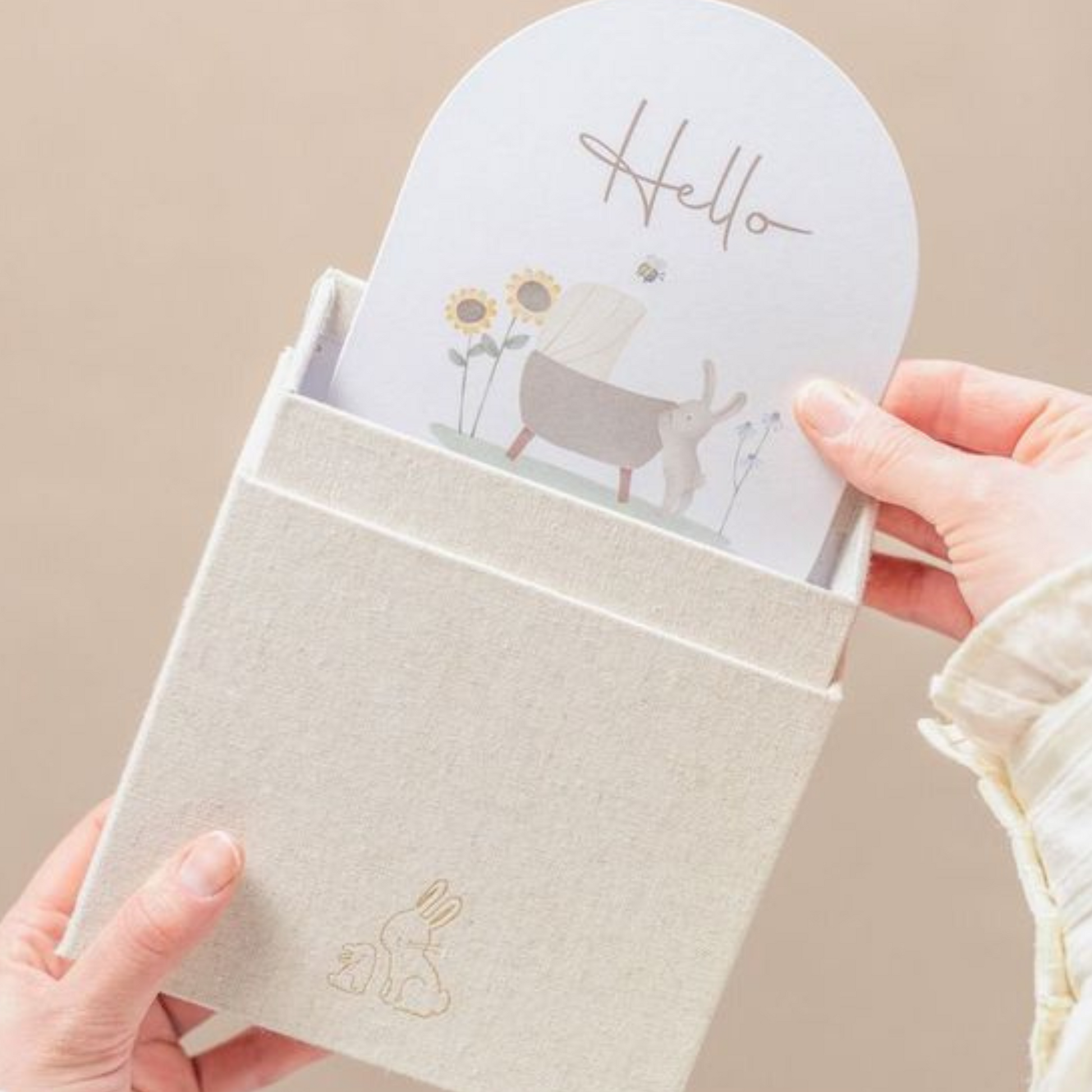 \nDe mijlpaalkaarten worden bewaard in een prachtig lichtbeige doosje, versierd met luxe linnen stof. Het doosje is gedecoreerd met de tekst ‘Little moments, big memories’ en het betoverende Baby Bunny ontwerp dat ook de mijlpaalkaarten siert. Het is de perfecte plek voor de onvergetelijke momenten van je kleine engeltje, waardoor het een schatkist van herinneringen wordt die een leven lang gekoesterd zullen worden.