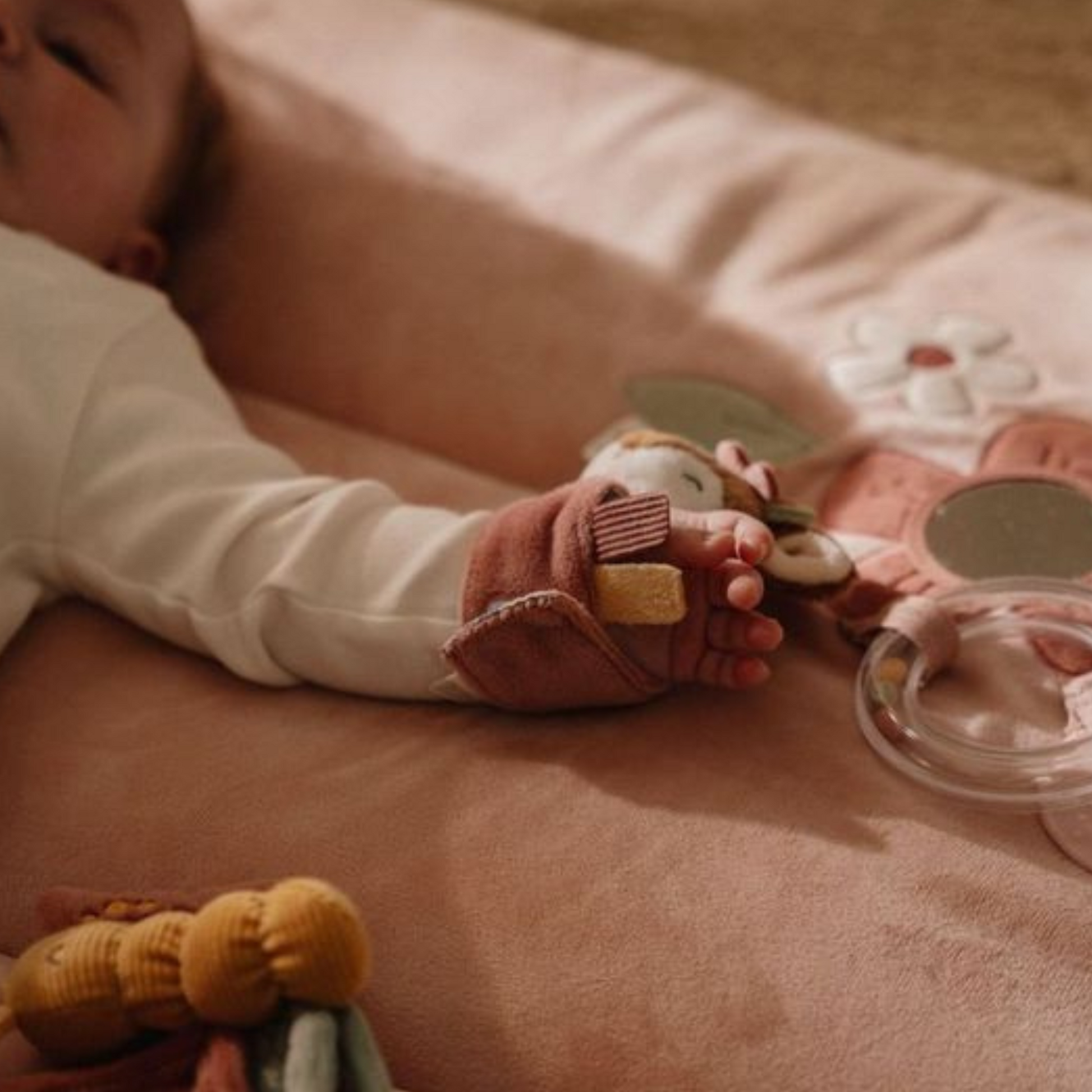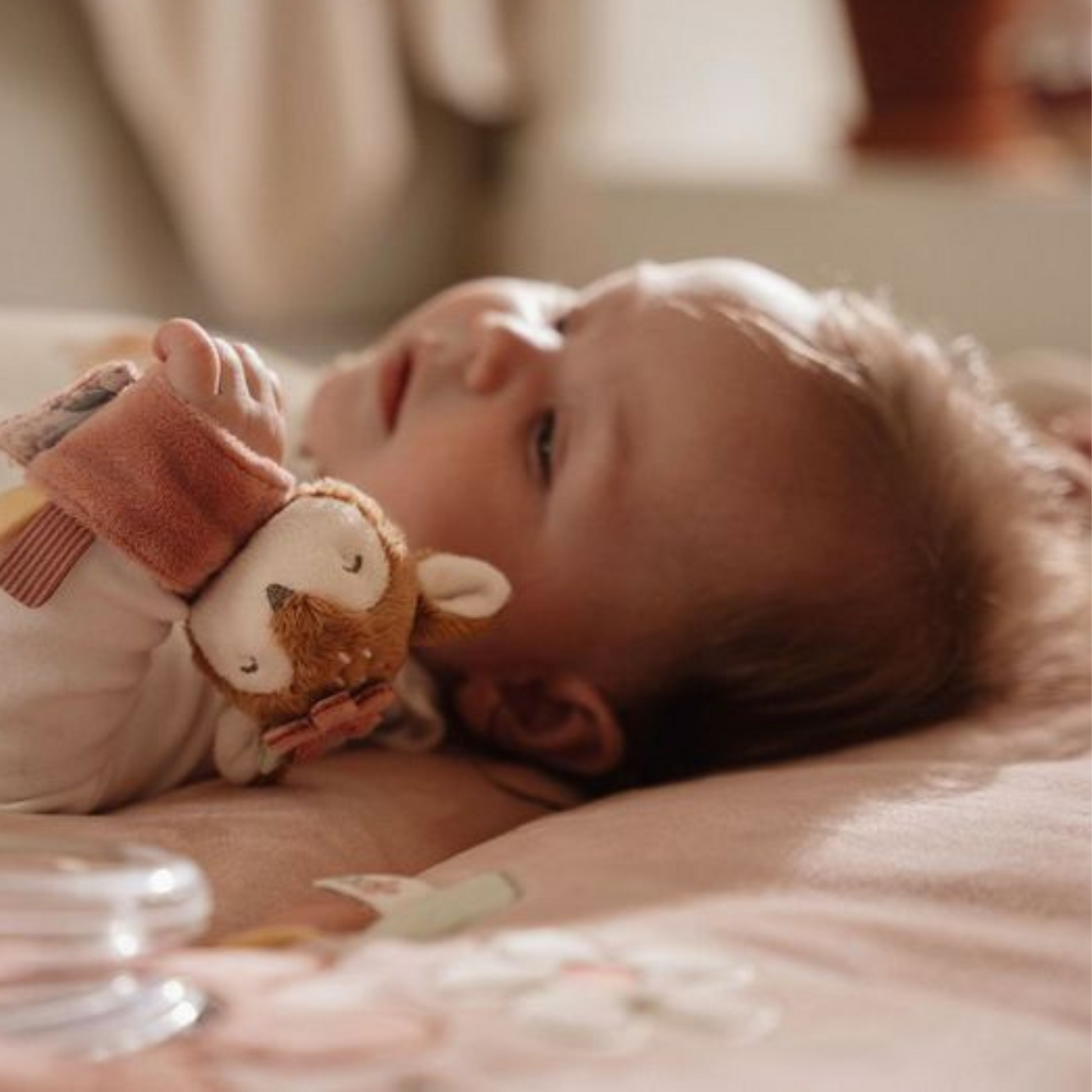 Wat zal je baby enthousiast worden van deze polsrammelaar. Doe hem om de pols van je kleintje en laat het ratelende plezier maar beginnen. Het knuffelige hertje bovenop de armband is klaar om te bewegen! Maar er is meer te ontdekken. De labels stimuleren je kindje om te voelen en te grijpen. Geweldig vermaak voor een blije baby.