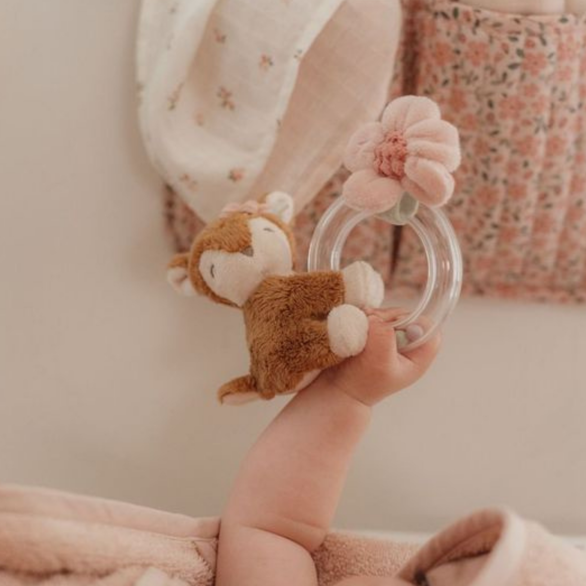 Het lieve hertje met haar zachte vacht nodigt je uit om te spelen en deze ringrammelaar te laten horen. Het kleine bloemetje heeft ze speciaal voor jou geplukt om mee te kroelen. De transparante ring is gevuld met 3 kleine kraaltjes die rammelen als je kindje ermee speelt. Dit aantrekkelijke babyspeeltje prikkelt niet alleen je baby’s zintuigen en nieuwsgierigheid, maar bevordert ook de hand-oogcoördinatie.
