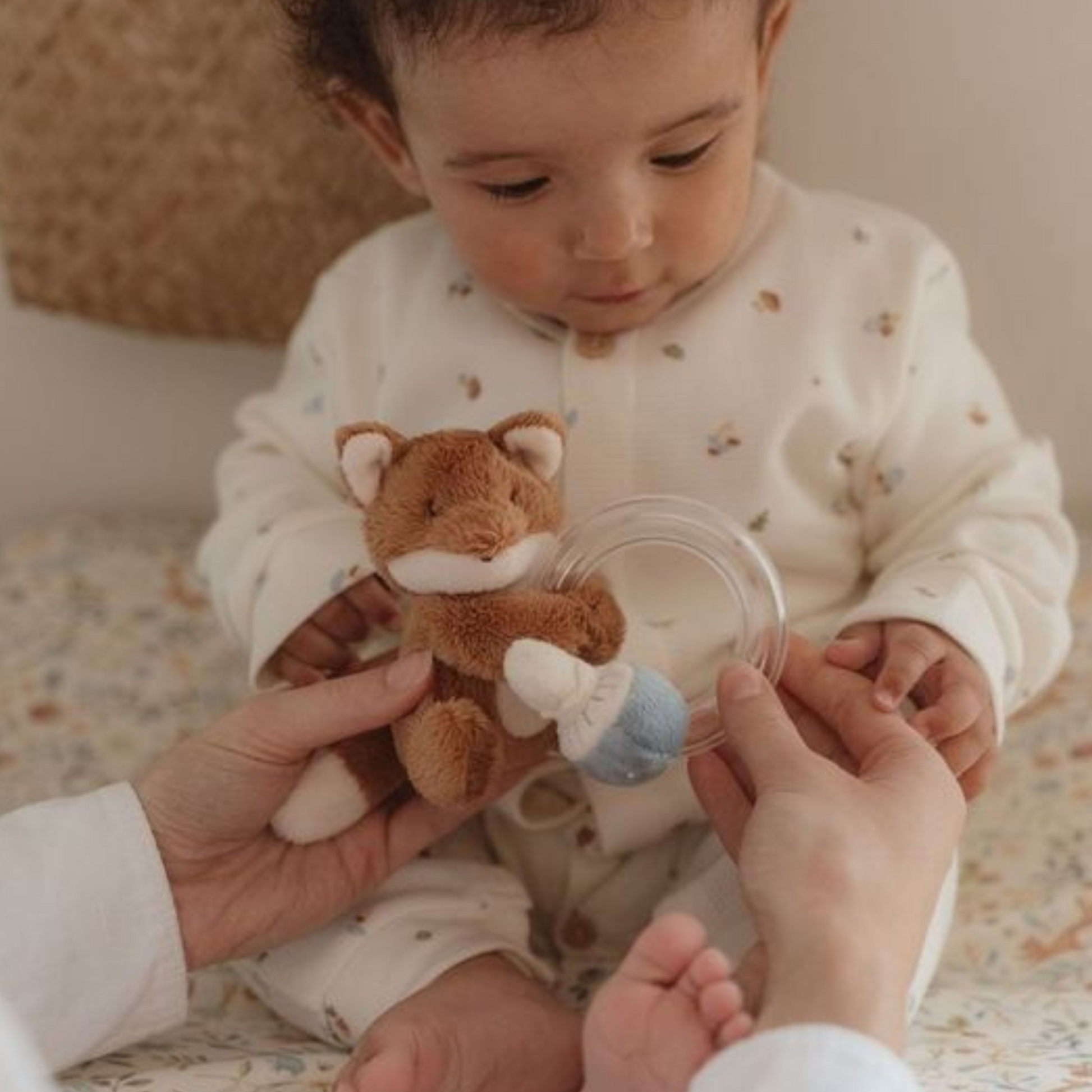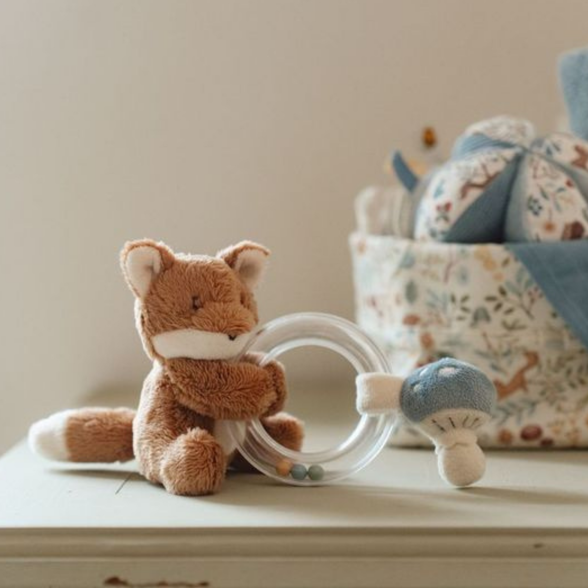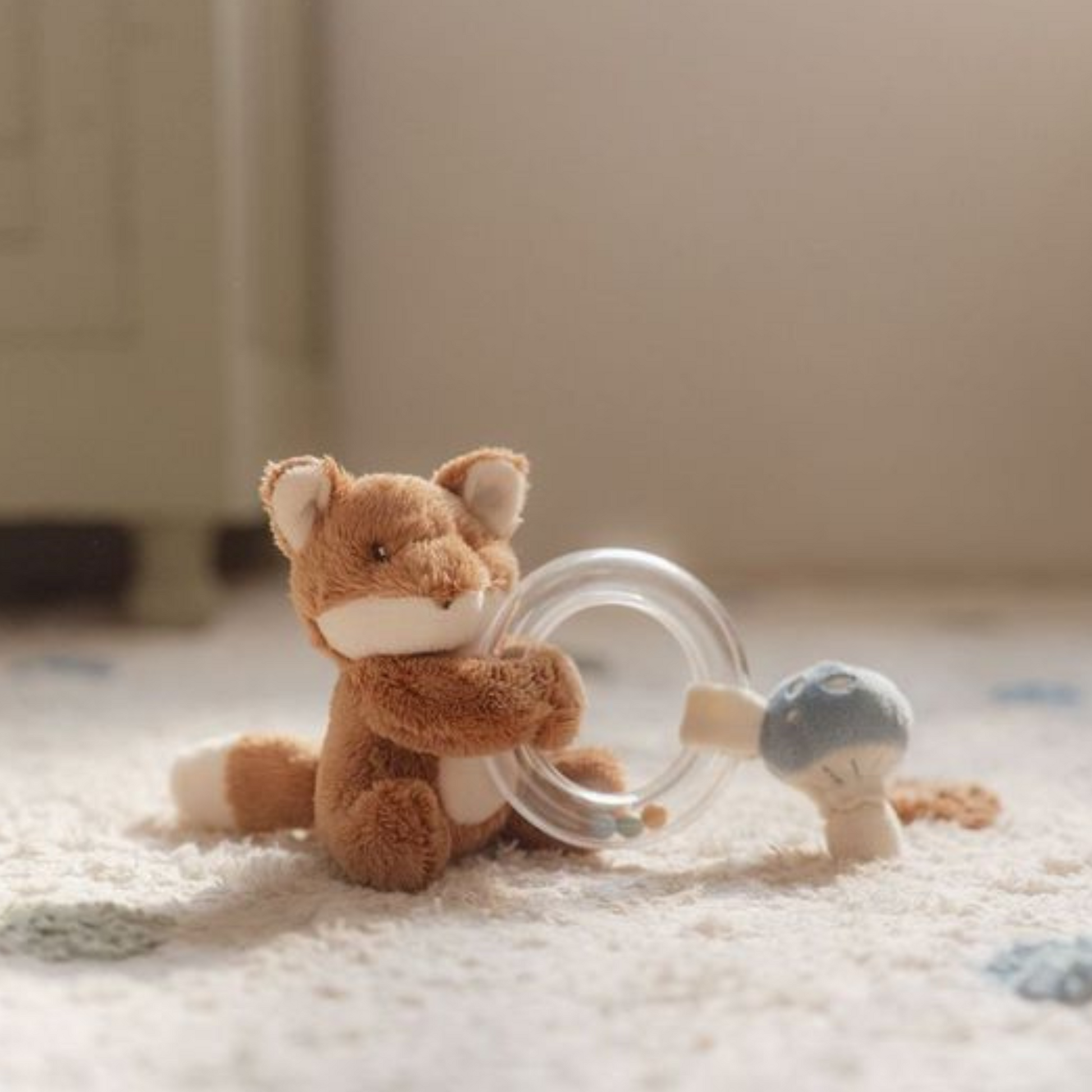 Het lieve vosje met zijn zachte vacht en kleine staart nodigt je uit om te spelen en deze ringrammelaar te laten horen. De kleine paddenstoel heeft hij speciaal voor jou geplukt om mee te kroelen. De transparante ring is gevuld met 3 kleine kraaltjes die rammelen als je kindje ermee speelt. Dit aantrekkelijke babyspeeltje prikkelt niet alleen je baby’s zintuigen en nieuwsgierigheid, maar bevordert ook de hand-oogcoördinatie.