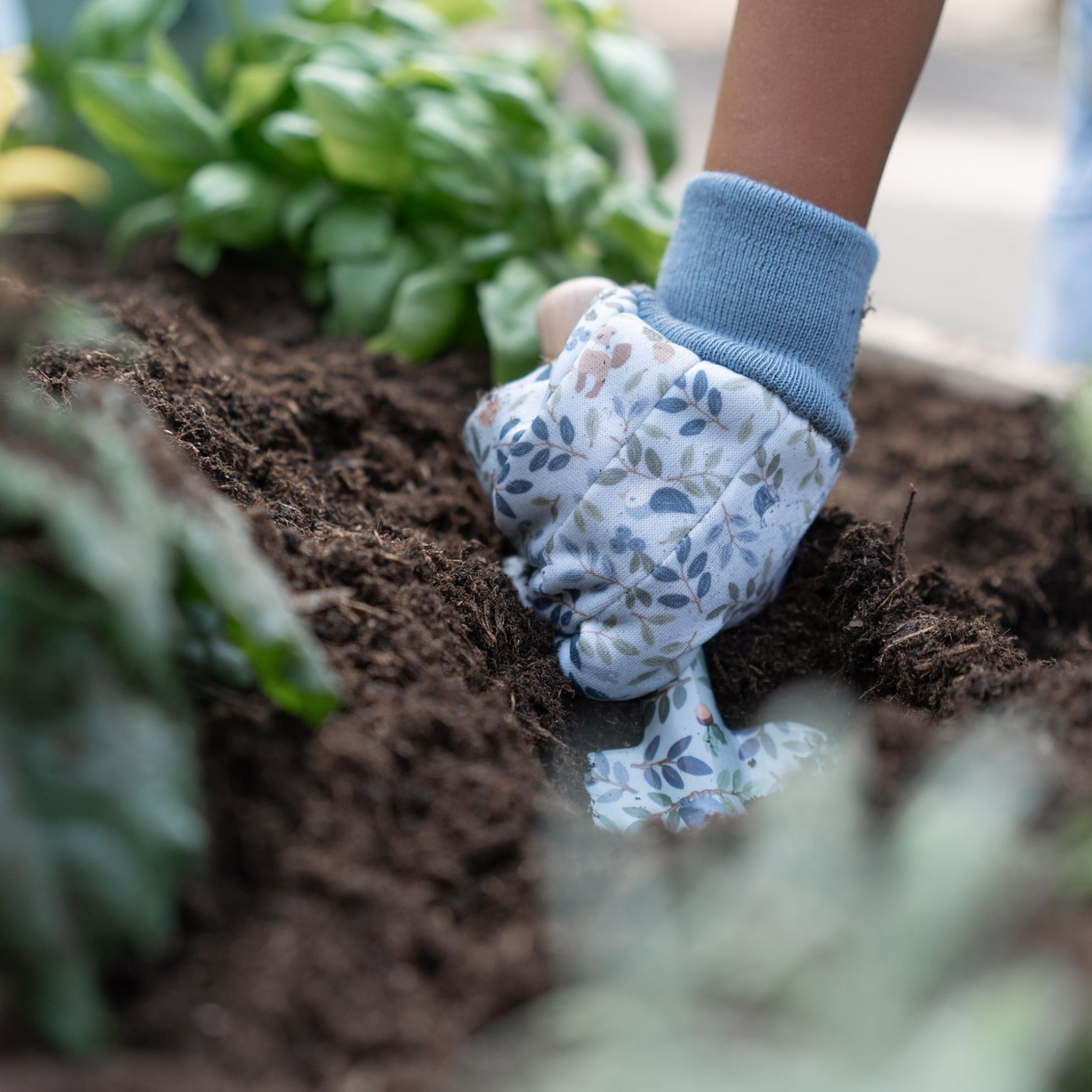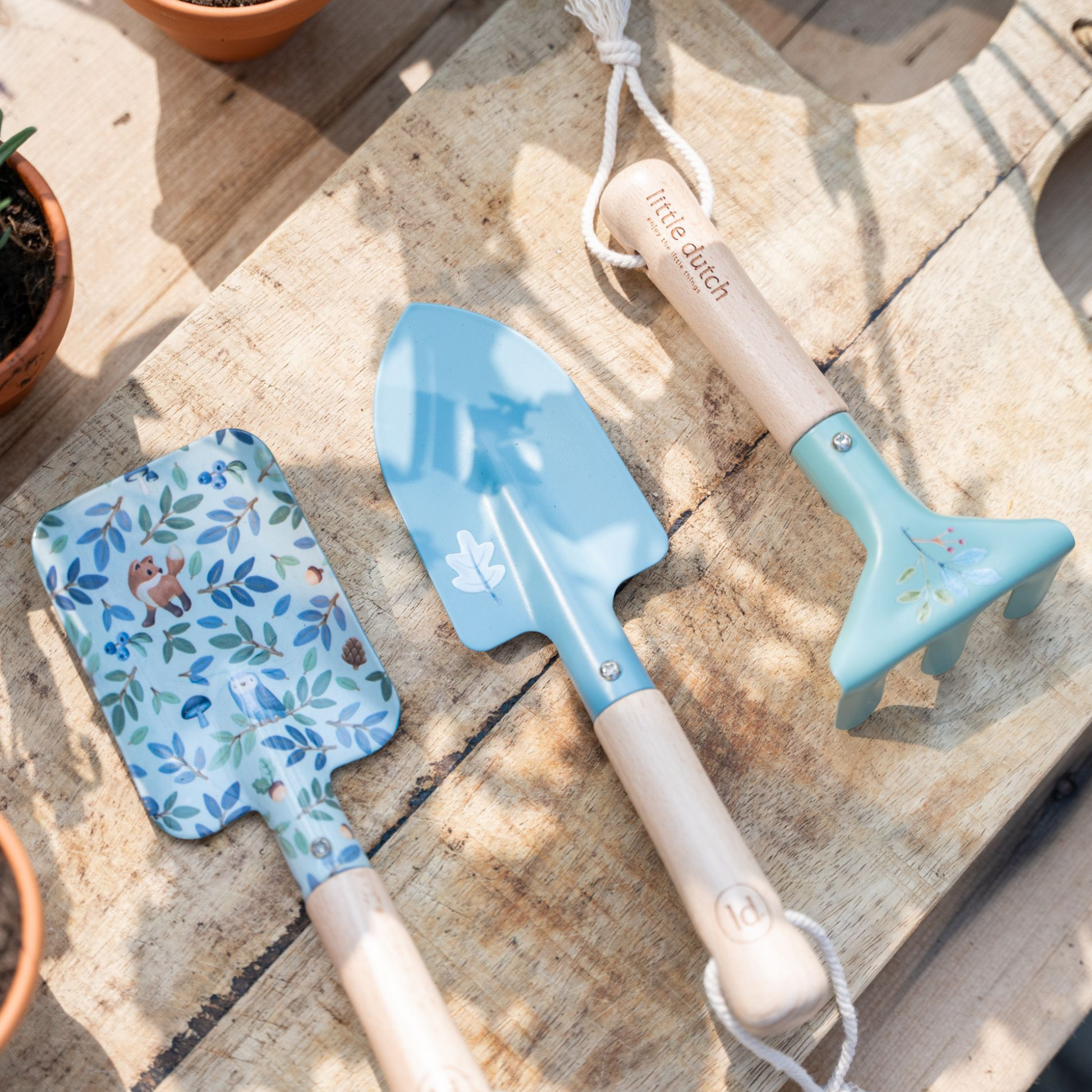 De set bestaat uit twee schepjes en een hark, allemaal gemaakt van stevig metaal met houten handvatten voor een comfortabele grip. Elk stuk is versierd met mooie illustraties en kleuren uit de collectie, perfect passend bij de avonturen van je kleintje in de tuin. Met de handige koordjes kun je het gereedschap makkelijk ophangen na het tuinieren. Perfect voor kleine handjes.