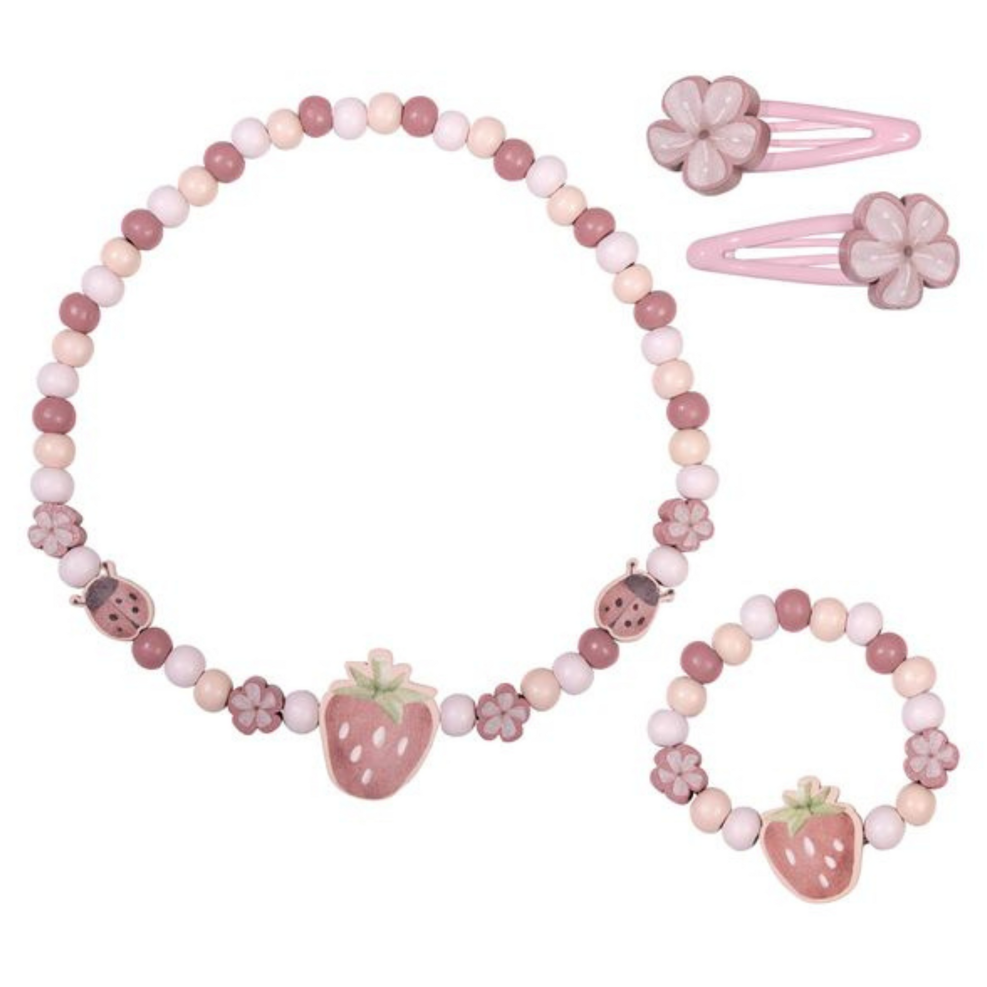 De set heeft prachtige zachte pastelkleurige houten kralen en unieke illustraties van aardbeien & bloemen. Door de zachte kleuren past het bij bijna elke outfit! Met de ketting, armband en twee haarclips ziet je kleintje er extra stralend uit. In combinatie met het sieradendoosje met muziek kan je kleintje ze ook nog eens stijlvol opbergen. Bovendien een ideale cadeautip.