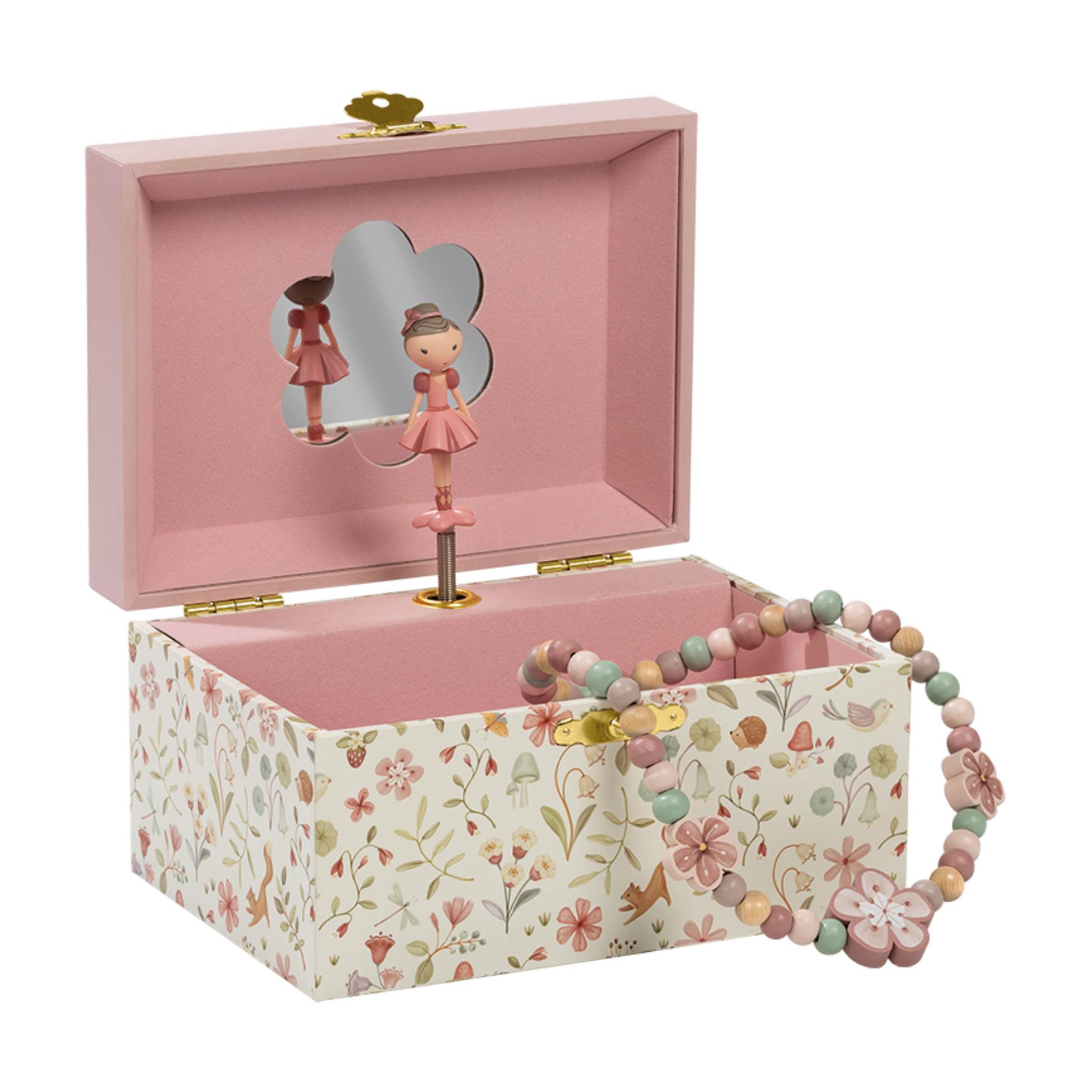 De set heeft mooie zachte kleuren en unieke illustraties van bloemen. Door de zachte kleuren past hij bij bijna elke outfit! Met de ketting, armband, ring en haarelastiekjes ziet je kleintje er extra stralend uit. In combinatie met het sieradendoosje met muziek kan je kleintje ze ook nog eens in stijl opbergen. Ook een ideale cadeautip.