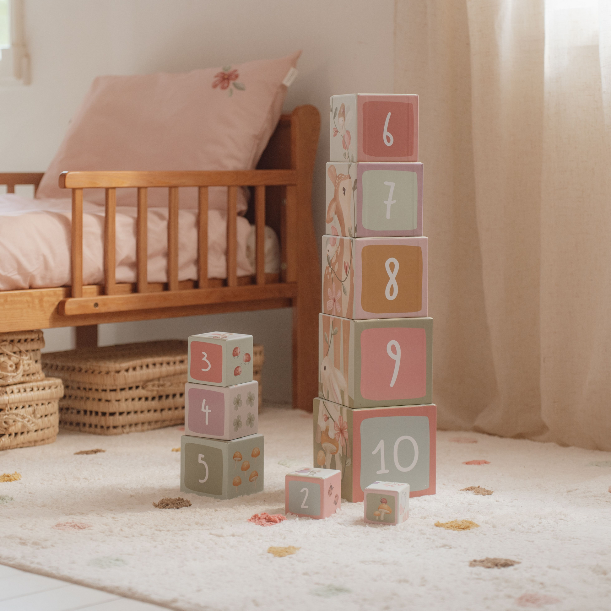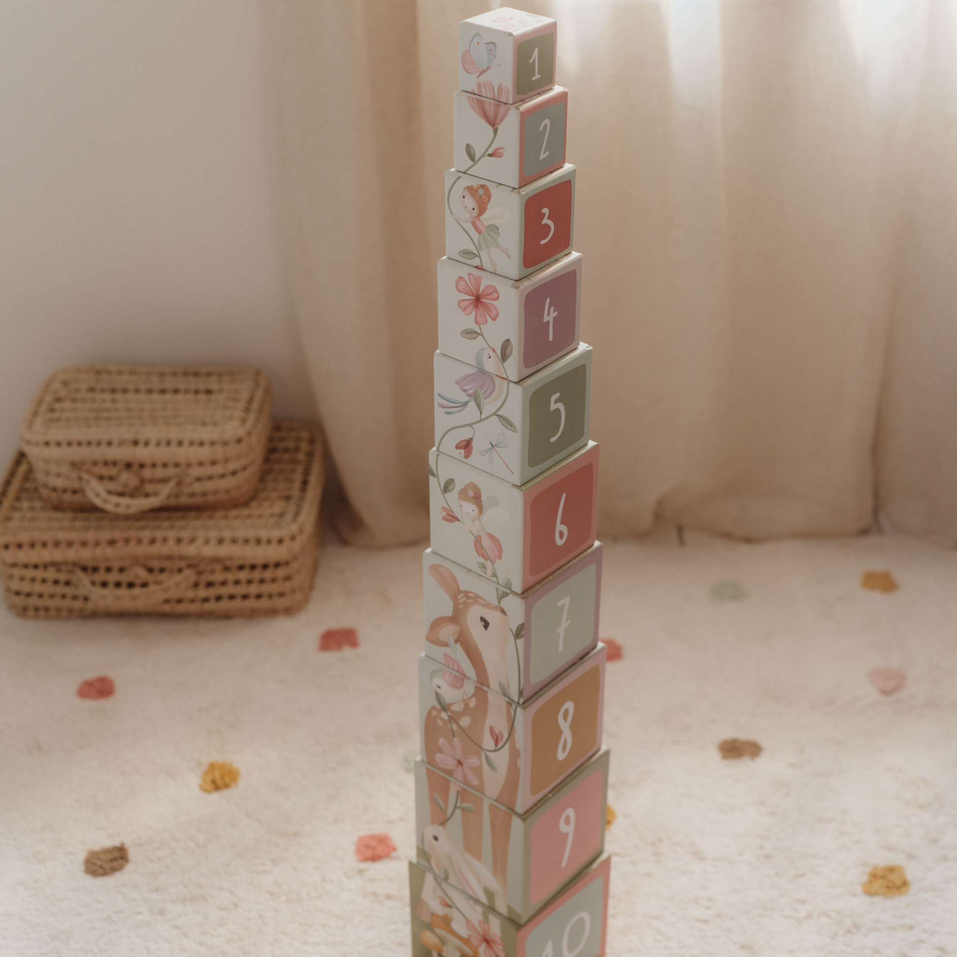 Je kunt de blokken op elkaar stapelen om een hoge toren te maken of ze horizontaal op de grond leggen. Ontdek vier betoverende taferelen terwijl je bouwt. Creëer een duurzame bloementak die wordt bewoond door de mooiste boswezens. Sorteer ze op twee manieren door te tellen, of verzamel alle afbeeldingen uit de magische tuin. Kinderen leren spelenderwijs tot 10 te tellen met deze stapelblokken. De blokken zijn voorzien van prachtige illustraties uit de Fairy Garden-collectie, waaronder herten, konijntjes, egels, feeën, lieveheersbeestjes en vrolijke bloemen. Om ze gemakkelijk op te bergen, passen de kleine blokjes in de grotere. Gemaakt van stevig karton, kunnen de blokken tegen een stootje. Het kleinste blokje is 5 cm en de grootste is 14 cm