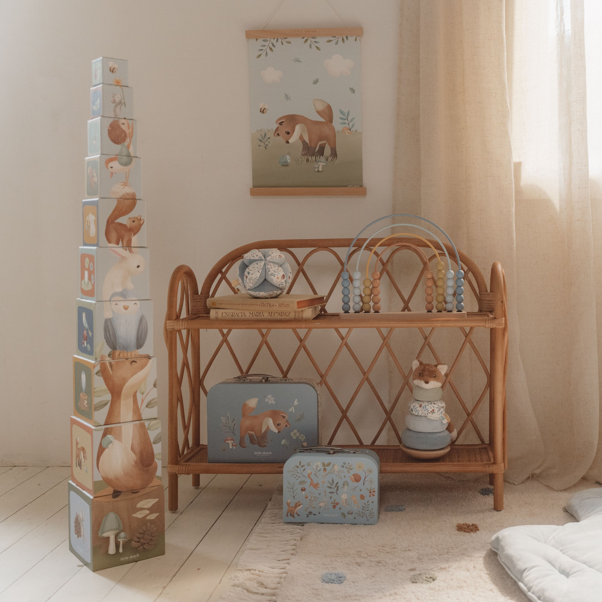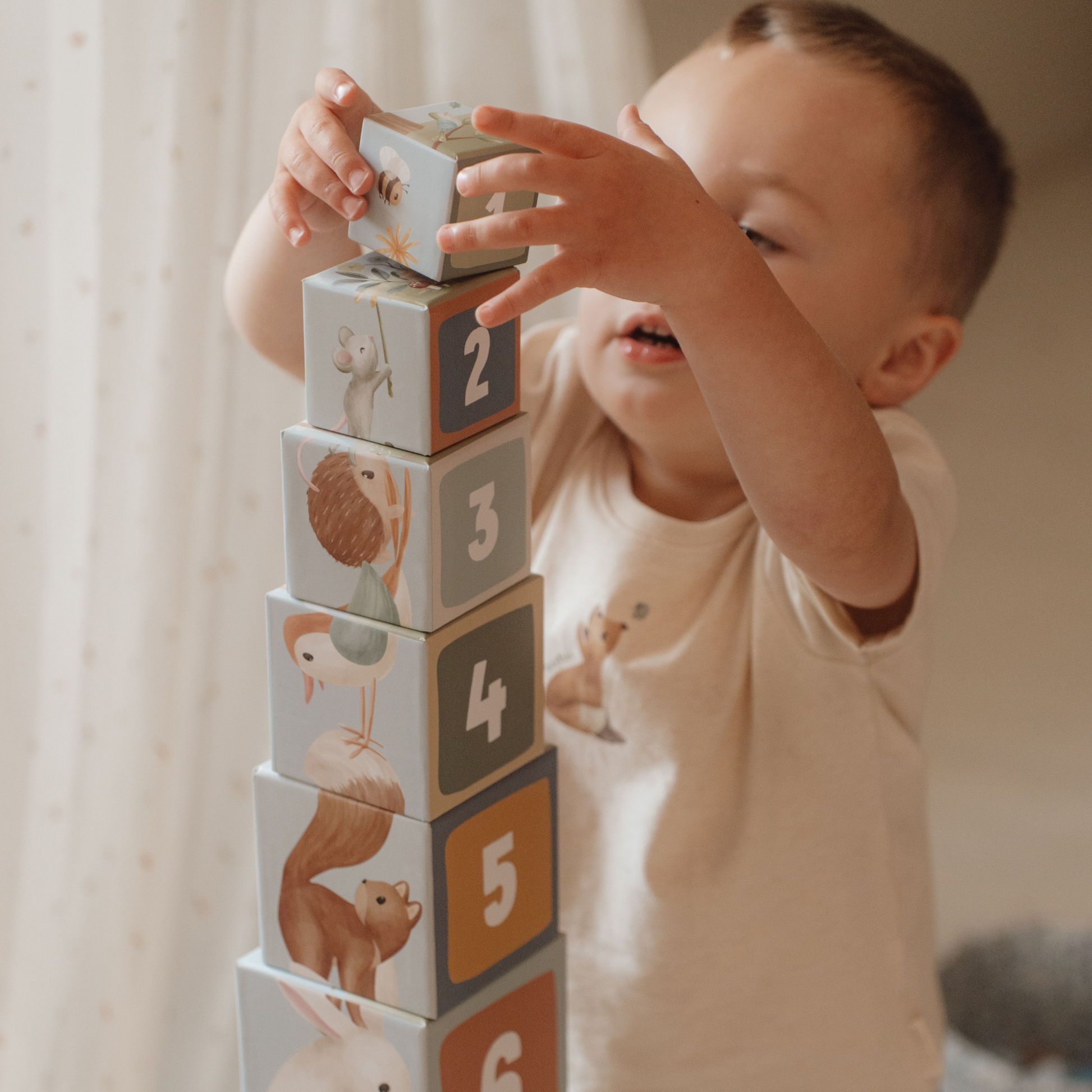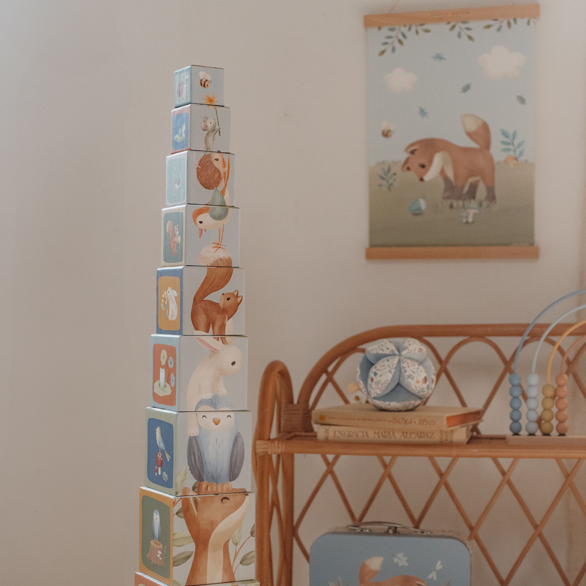Je kunt de blokken op elkaar stapelen om een hoge toren te maken of ze horizontaal op de grond leggen. Ontdek vier betoverende taferelen terwijl je bouwt. Plaats het ene dier op het andere, van groot naar klein. Sorteer ze op twee manieren door te tellen, of verzamel alle afbeeldingen uit het betoverende bos. Kinderen leren spelenderwijs tot 10 te tellen met deze stapelblokken. De blokken zijn voorzien van prachtige illustraties uit de Forest Friends-collectie, waaronder eekhoorns, vossen, konijntjes, egels, uilen en paddenstoelen. Om ze gemakkelijk op te bergen, passen de kleine blokjes in de grotere. Gemaakt van stevig karton, kunnen de blokken tegen een stootje. Het kleinste blokje meet 5 cm en de grootste is 14 cm.