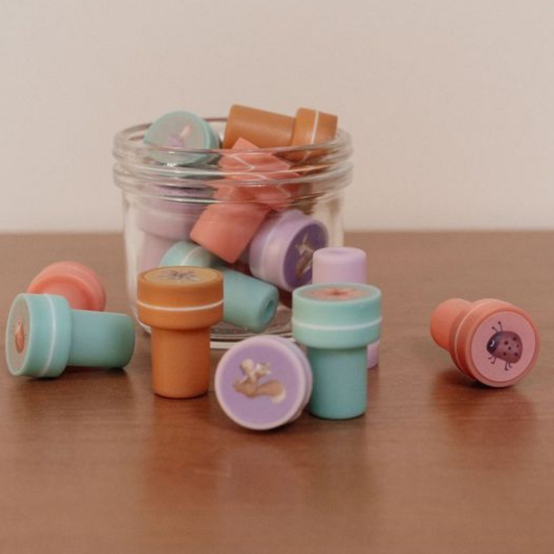 Deze stempelset bevat 16 verschillende stempels, waaronder praktische hertjes, eekhoorntjes en lieveheersbeestjes, maar ook een aardbei, bloemen en een bij. De stempels zijn zelfinkend, dus je hebt geen losse inkt nodig - gemakkelijk en direct klaar voor gebruik! Een leuke en praktische manier om de creativiteit van kinderen te stimuleren en hun fijne motoriek te ontwikkelen. Geschikt voor kinderen vanaf 3 jaar.