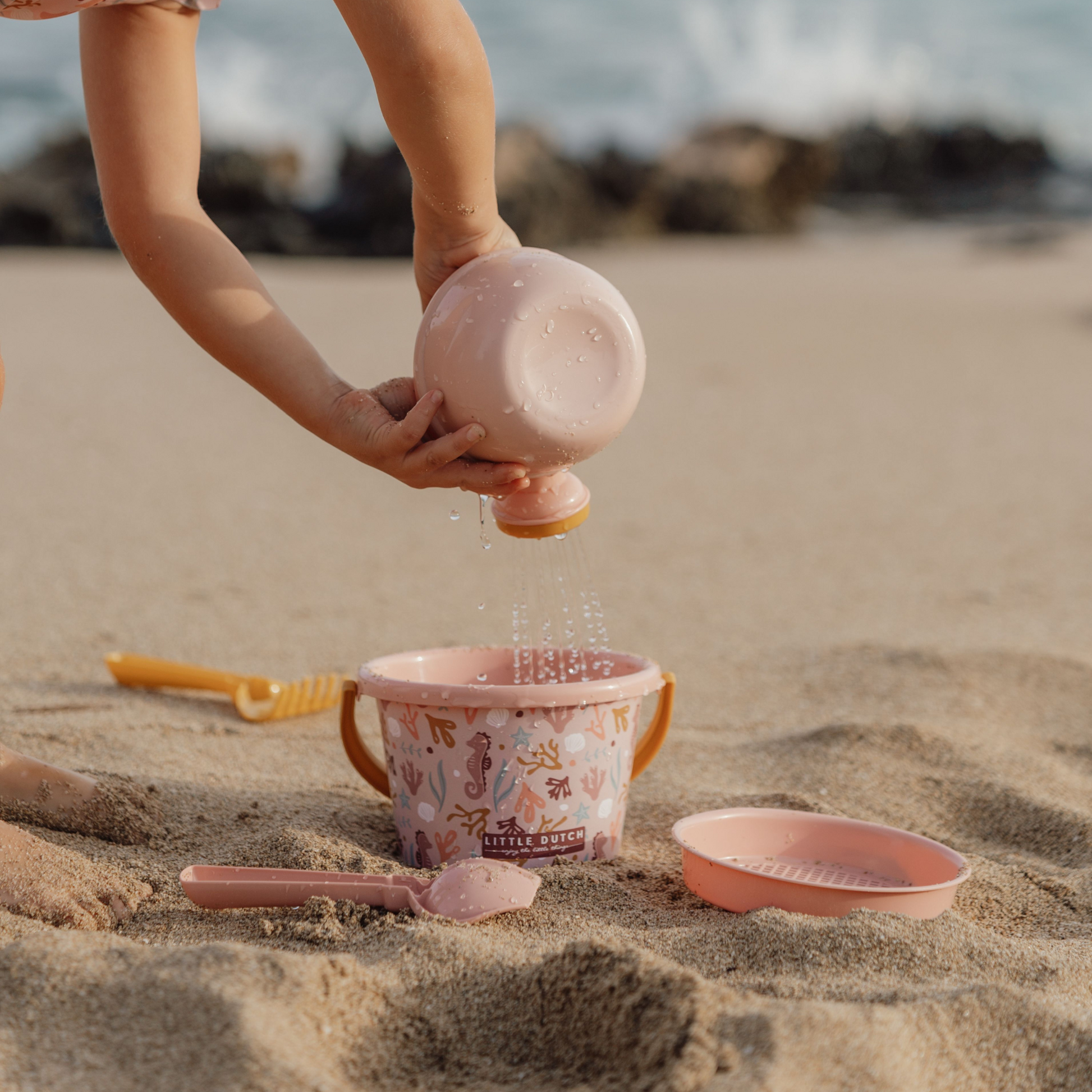 Dit is je nieuwe favoriete set om mee te nemen naar het strand of de zandbak. Of je nu een kuil wilt graven, zandsculpturen wilt bouwen, je ouders met zand wilt bedekken, schelpen wilt verzamelen of met water wilt spelen, deze mooie speelgoedstrandset Ocean Dreams Pink heeft alles wat je nodig hebt. Met de emmer, schep en hark, gieter en zandzeef heeft je kleintje urenlang speelplezier in het zand.