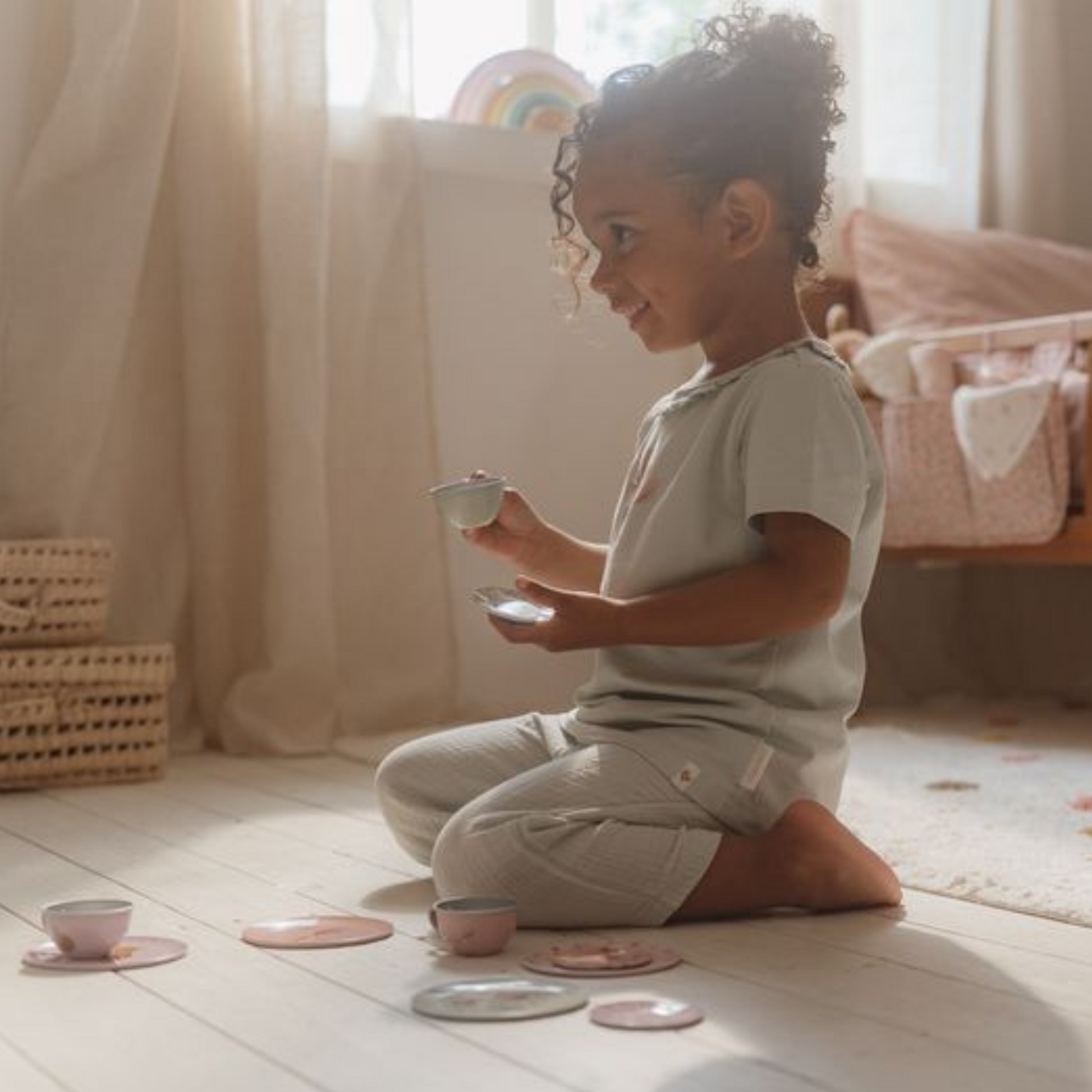 Met dit schattige tinnen theeservies speelt je kind een geweldig rollenspel. Dit Fairy Garden theesetje prikkelt de fantasie van kinderen en stimuleert de fijne motoriek. De set bestaat uit vier kleine theekopjes, vier schoteltjes, vier gebaksbordjes en een theepot met deksel. Let op: berg het product na gebruik droog op. Wordt geleverd in windowbox. Geschikt voor kinderen vanaf 36 maanden.