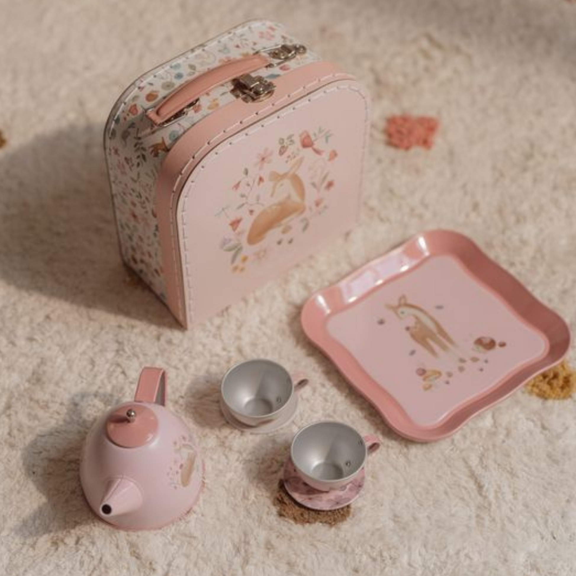 Dit tinnen theesetje bestaat uit twee theekopjes, twee schotels, een dienblad en een theepot met deksel. Stop het in het fraaie picknickkoffertje en neem het setje overal mee naartoe. Het koffertje is voorzien van een kleurrijke regenboogprint. Bovendien zorgt het spelen met het theeservies ervoor dat de motorische en sociale vaardigheden worden gestimuleerd. Geschikt vanaf 3 jaar. Materiaal: metaal.