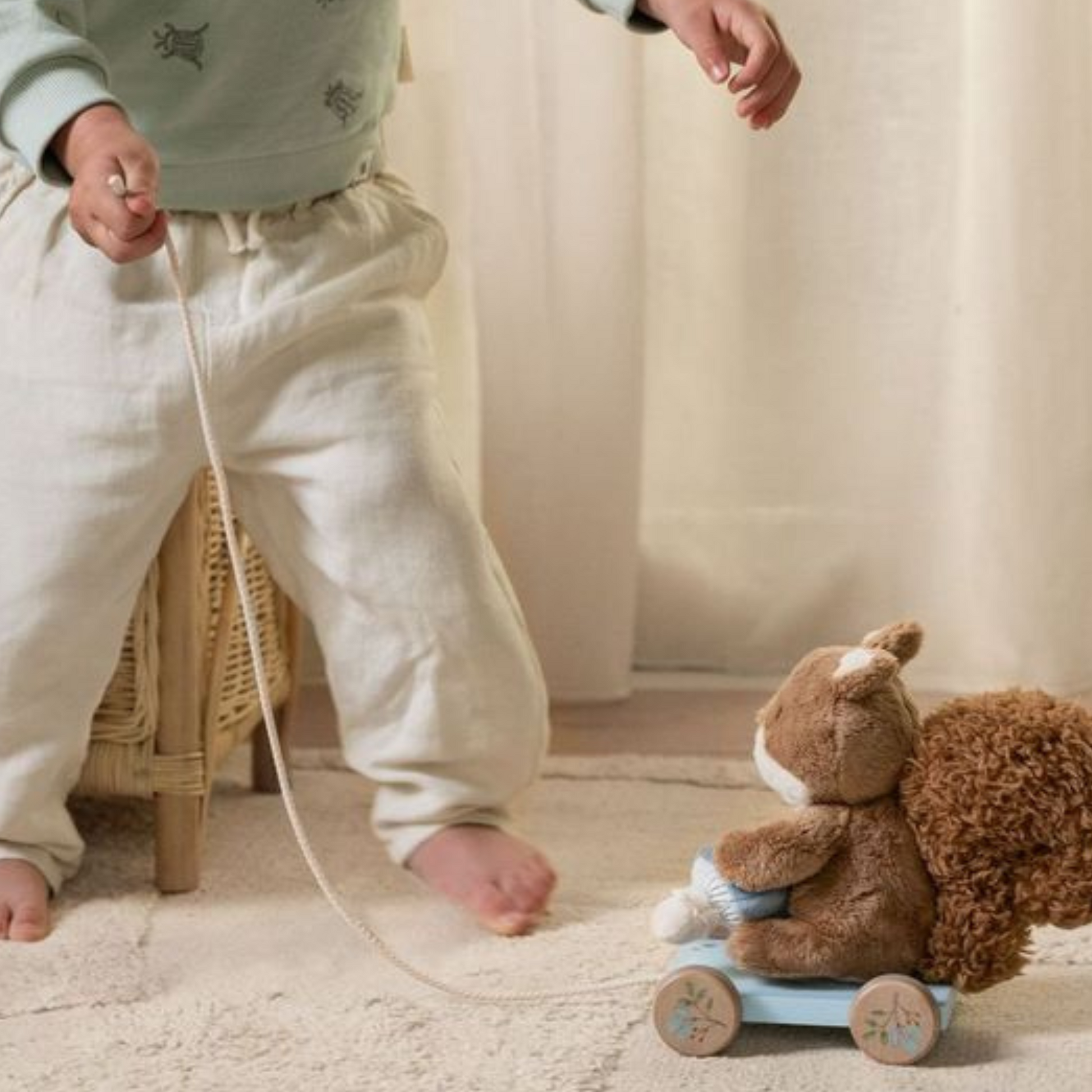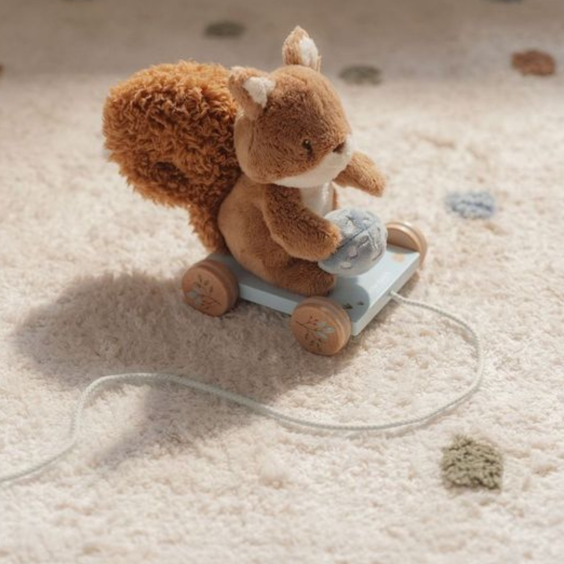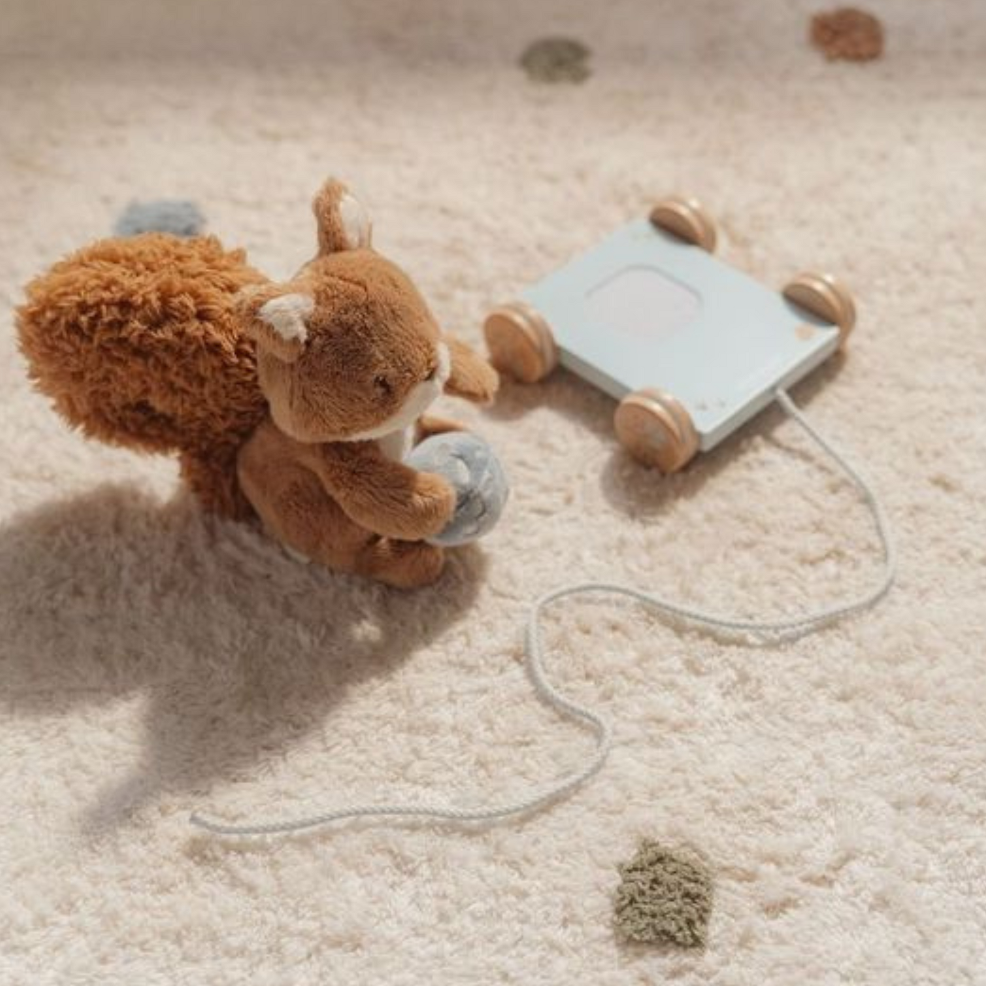 Trek aan het touwtje en ga samen op avontuur. De eekhoorn zal je volgen door het betoverende bos van Forest Friends, waar vriendelijke diertjes met blaadjes, eikels, dennenappels en paddenstoelen spelen tussen de hoge bomen. De zachte en knuffelige eekhoorn staat op een blauwe houten wagen versierd met blaadjes. Met het kleine touwtje kan je kindje hem het hele huis laten zien en heerlijk spelen. Het schattige trekdier zal aanmoedigen om te lopen en helpen bij de motorische ontwikkeling.