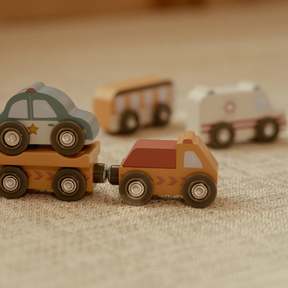 Laat de brandweer uitrukken, de politie patrouilleren of de vrachtwagen goederen bezorgen. Dankzij het stevige hout en de rubberen wielen zijn de voertuigen ideaal voor fantasierijk rollenspel en stimuleren ze motoriek en creativiteit.