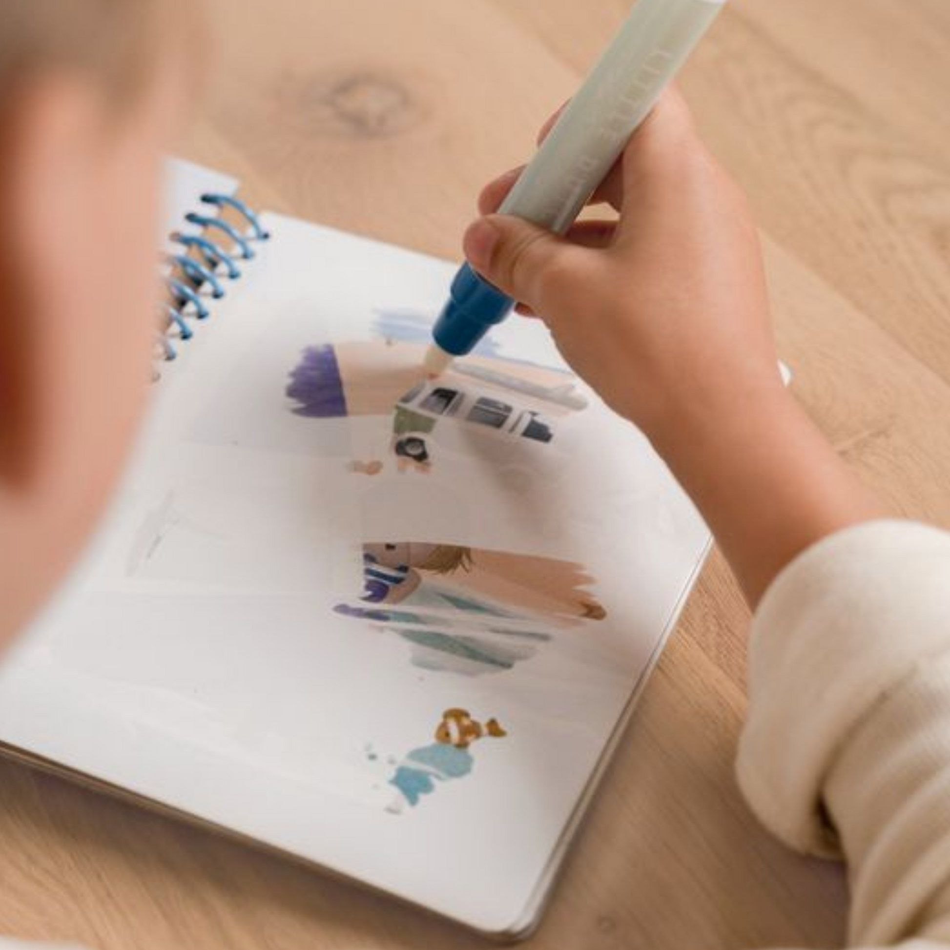Met de magische stift kunnen kinderen kleuren met water door ermee over de tekeningen te gaan. De kleuren toveren tevoorschijn! Ga mee op avontuur met Jim en z’n vriendjes onder water, op de boerderij, het strand, op safari en in de ruimte. De kleurset bestaat uit vijf stevige kleurkaarten en een stift die kan toveren als hij gevuld is met water.