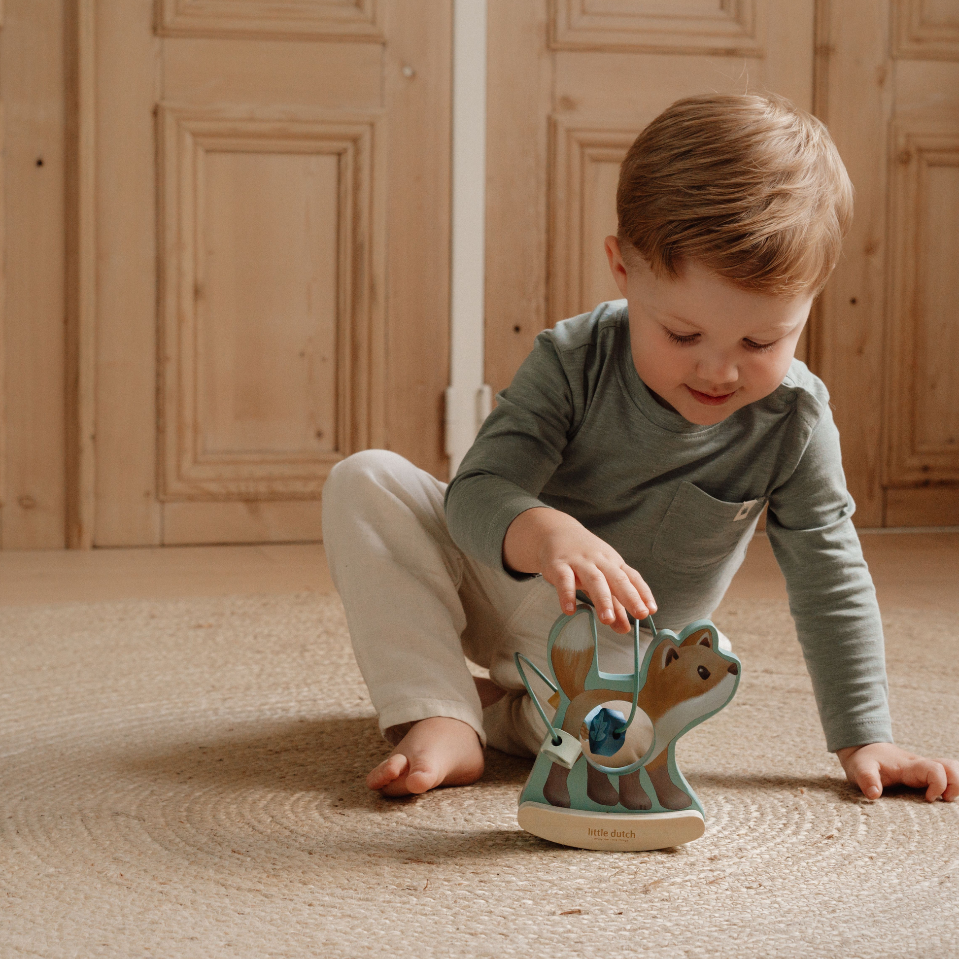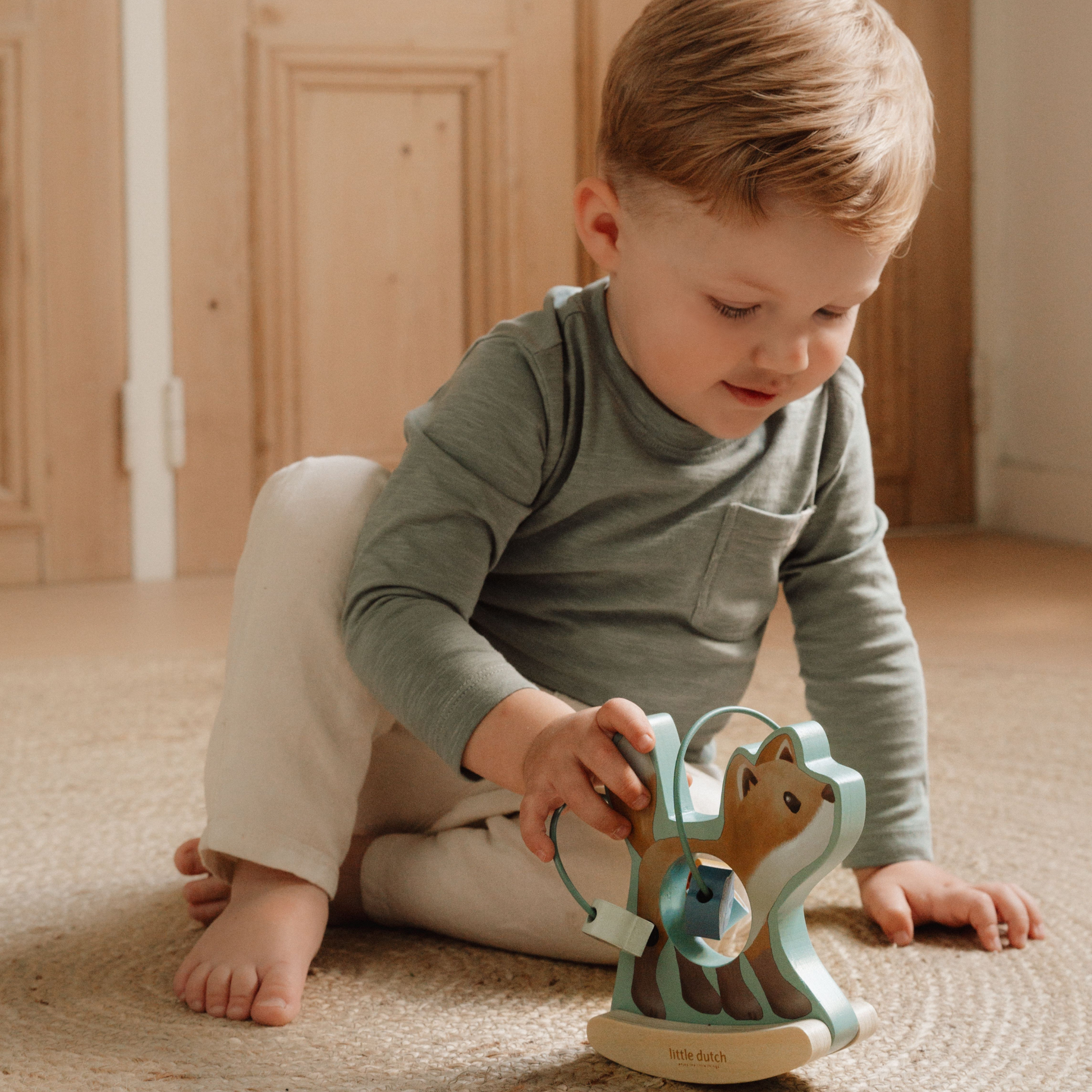 Dit vriendelijke vosje nodigt je uit om hem een klein duwtje te geven, waardoor hij langzaam begint te dansen in het betoverende bos. In de vorm van bladeren volgen dennenappels en paddenstoelen de kralen het spiraalvormige pad rondom het vosje. Dit lieve wiebeldier grondstoffen niet alleen spelenderwijs de motorische vaardigheden, maar staat ook prachtig als decoratie in de kinderkamer.