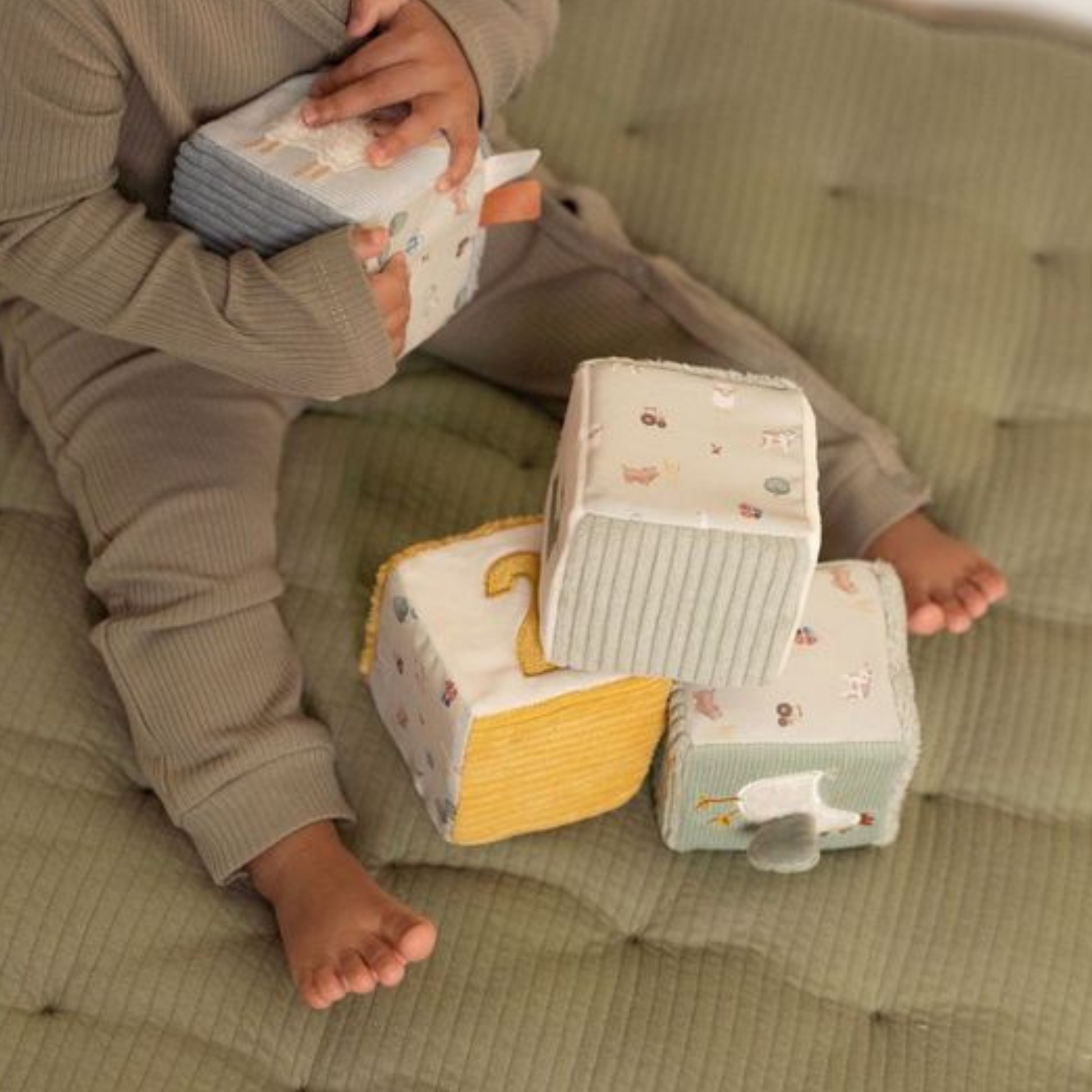 Met verschillende geluiden, texturen en kleuren om te ontdekken zal deze vrolijke set zachte activiteitenblokken uit de Little Farm collectie je kleintje uren bezighouden. Daarnaast wordt de hand-oogcoördinatie van je kindje spelenderwijs gestimuleerd. De set bestaat uit 4 zintuiglijke blokken, elk gedefinieerd door zachte kleuren en een uniek nummer. Babyhandjes zullen daarnaast leuke labels, pluche panelen en een zonnig spiegeltje ontdekken.